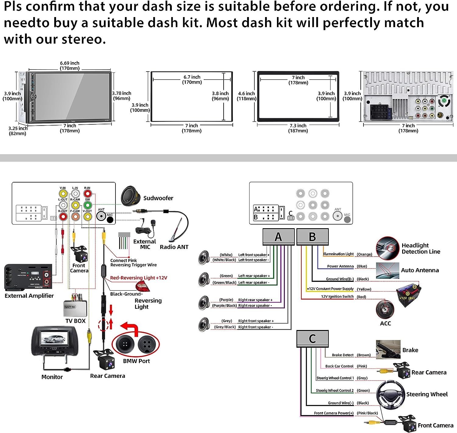 • 🚘【Important Tips】① Please make sure your dash board opening size fits our car stereo. If our stereo size does not meet your dash size, you would need to purchase an additional suitable dash kit. ② Please read the instructions before installation and it is recommended to install at a professional car audio shop. ③ Some cars may also require two additional after accessories to complete the installation: Wire harness adapter and radio antenna adapter for your car model.