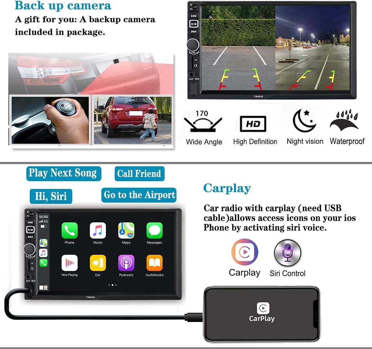 • 【Rear View Camera】Our apple carplay double din car audio receivers equipped with an HD camera, after connected with the rear camera, you can see the video on the radio screen through the rear view camera when reversing your car. The 7-inch touch screen will automatically display the reverse image once you pull in reverse. Make your daily reversing safer. (We support 90 days no reason to return or replacement.)