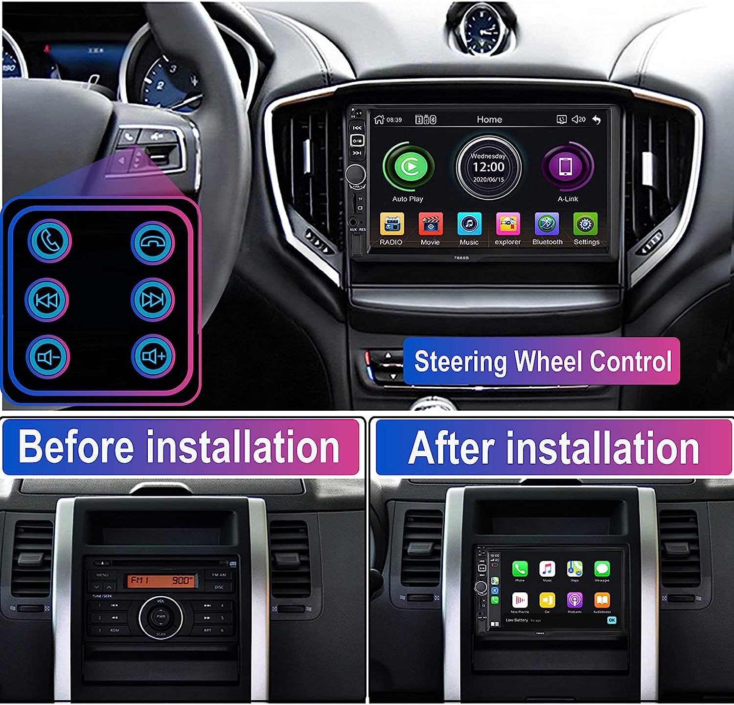 • 【7-Inch Double Din Touchscreen Car Stereo】7-inch capacitive screen designed. Universal double din standard universal size 7.4 inch×4.6 inch×2.6 inch to fit most vehicles. Our apple carplay double din stereo is equipped with a 7-inch HD capacitive touch screen and it makes more sensitive and accurate.