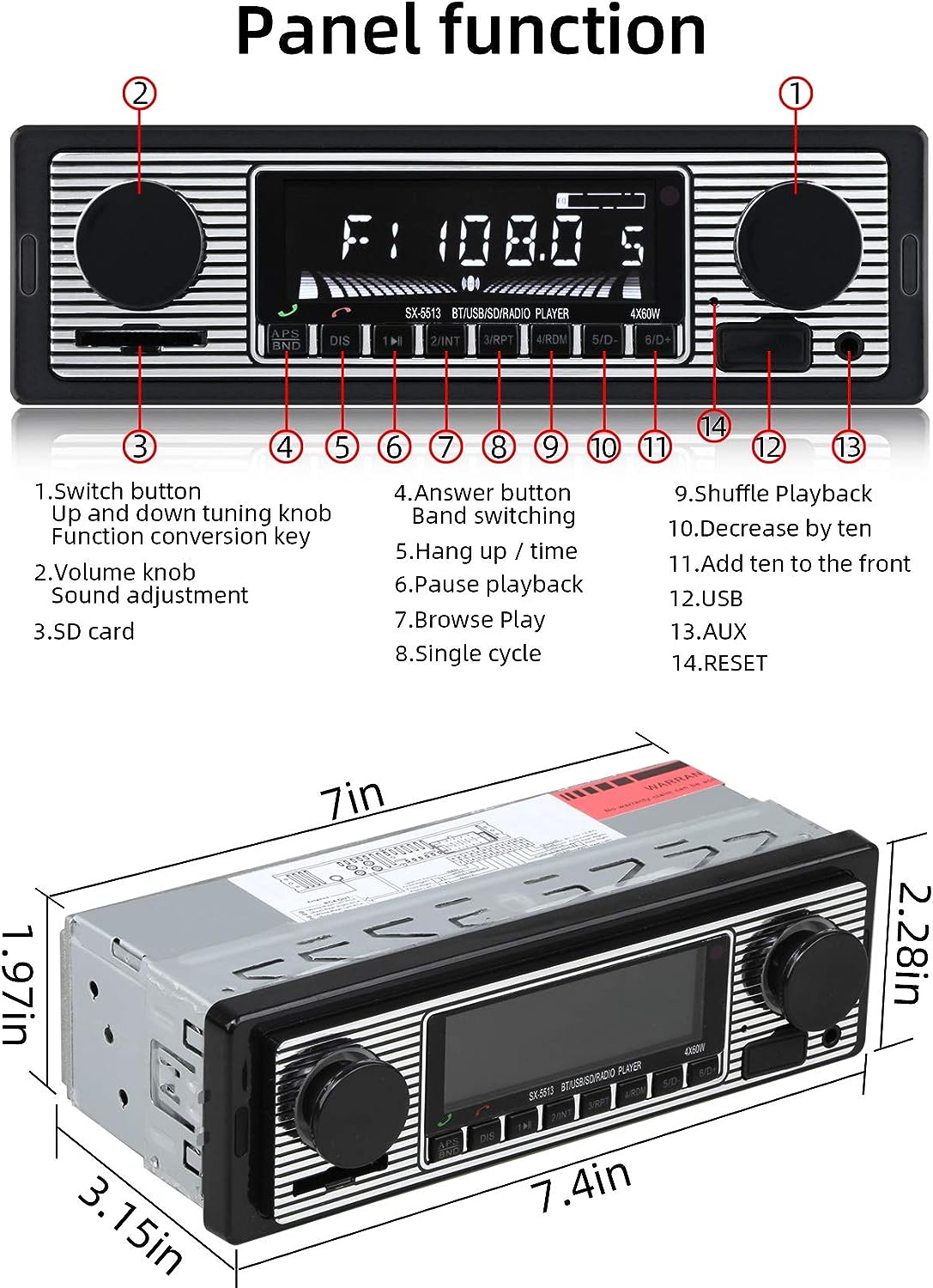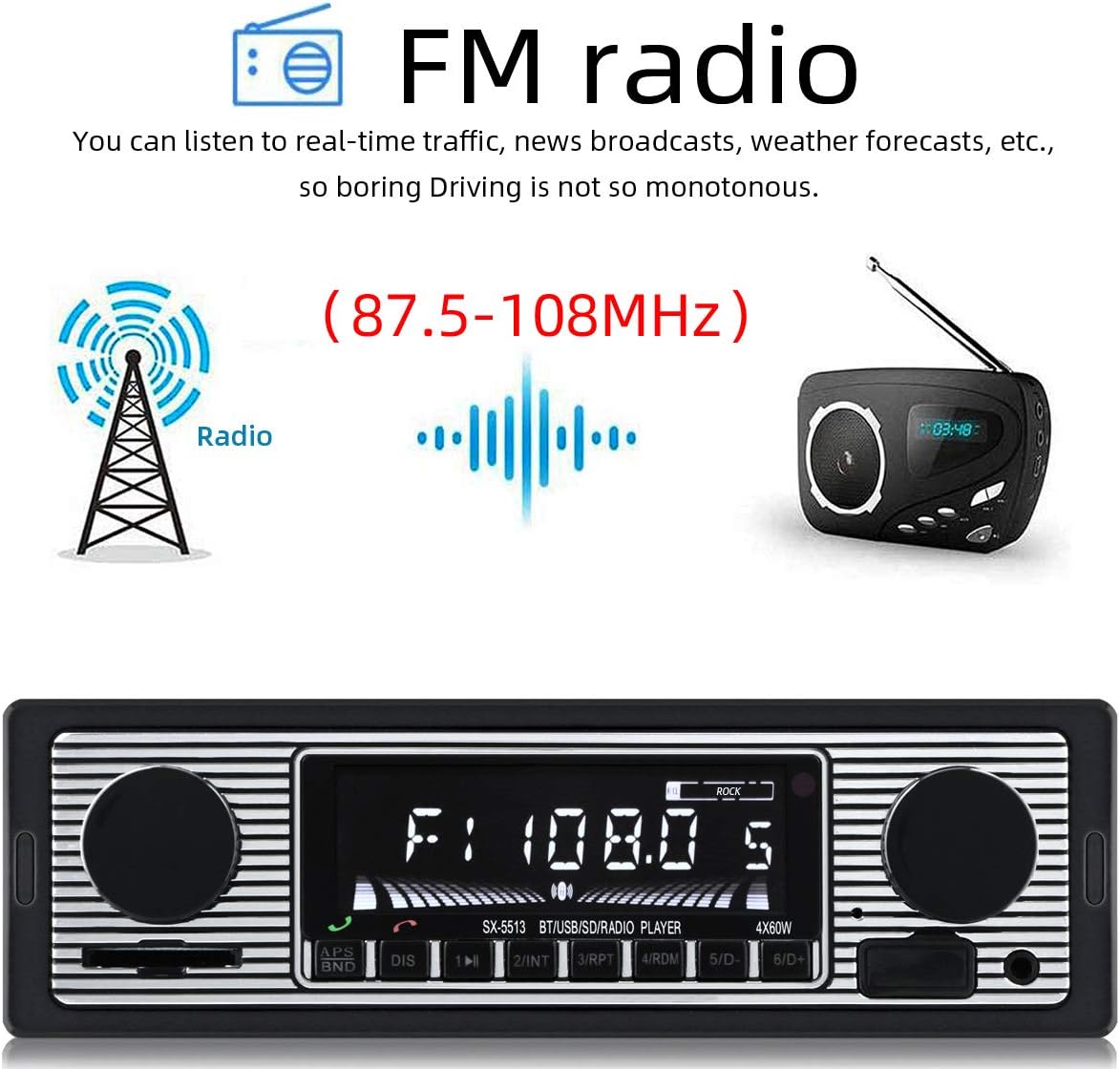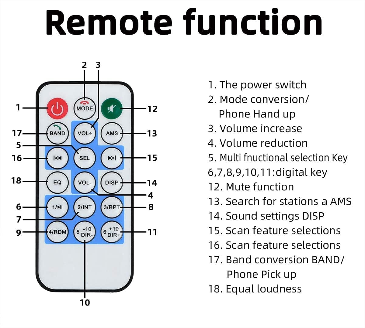 FM: Support three-band radio store FM1-FM2-FM3, and can preset 18 radio stations. (Radio frequency: 87.5-108MHz)