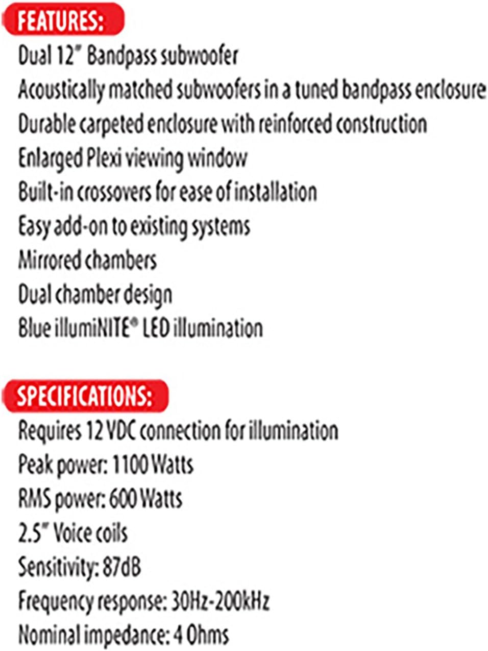 Dual Electronics BP1204 12 inch illumiNITE High Performance Studio Enclosed Subwoofers with 1,100 Watts of Peak Power is a force to be reckoned with. Your high performance subs were engineered specifically with you in mind. The specialized tuned port with computer aided design and 2.5” Voice Coils vastly increases output efficiency for your subwoofers providing you with consistent low sounding bass. Its computer-tuned acoustic chambers delivers up to 1,100 Watts of Peak Power, 600 Watts RMS at a 4 Ohm impedance and Frequency Range between 30Hz – 200Hz for unmatched output efficiency that suffices even bass enthusiasts.