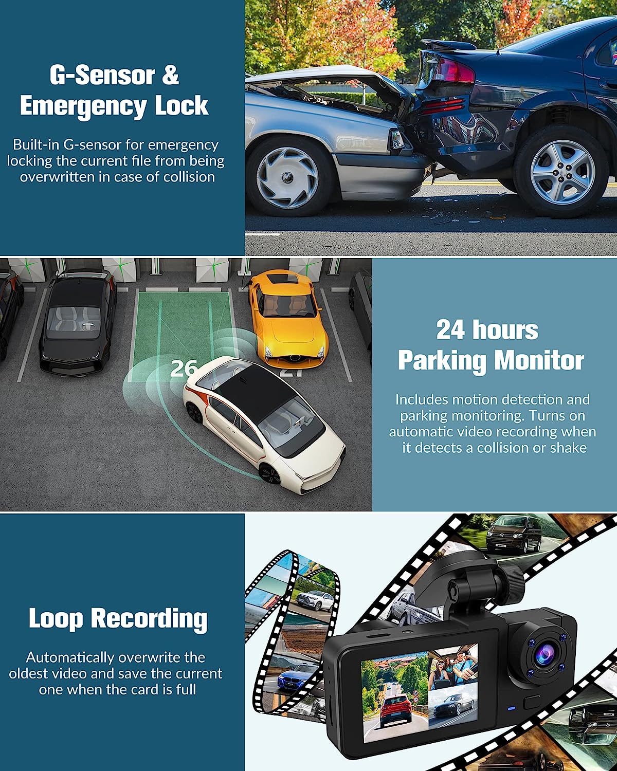 • 【Car Camera - Dash Cam Front and Rear】Seamless Loop Recording & Emergency Accident Locks,Loop recording can cover the earliest video when the SD card is full, and the car recorder can record continuously. When the built-in gravity sensor is enabled, it will automatically start recording for 30 seconds off when a sudden car shake/crash is detected. The video will be locked and will not be overwritten.