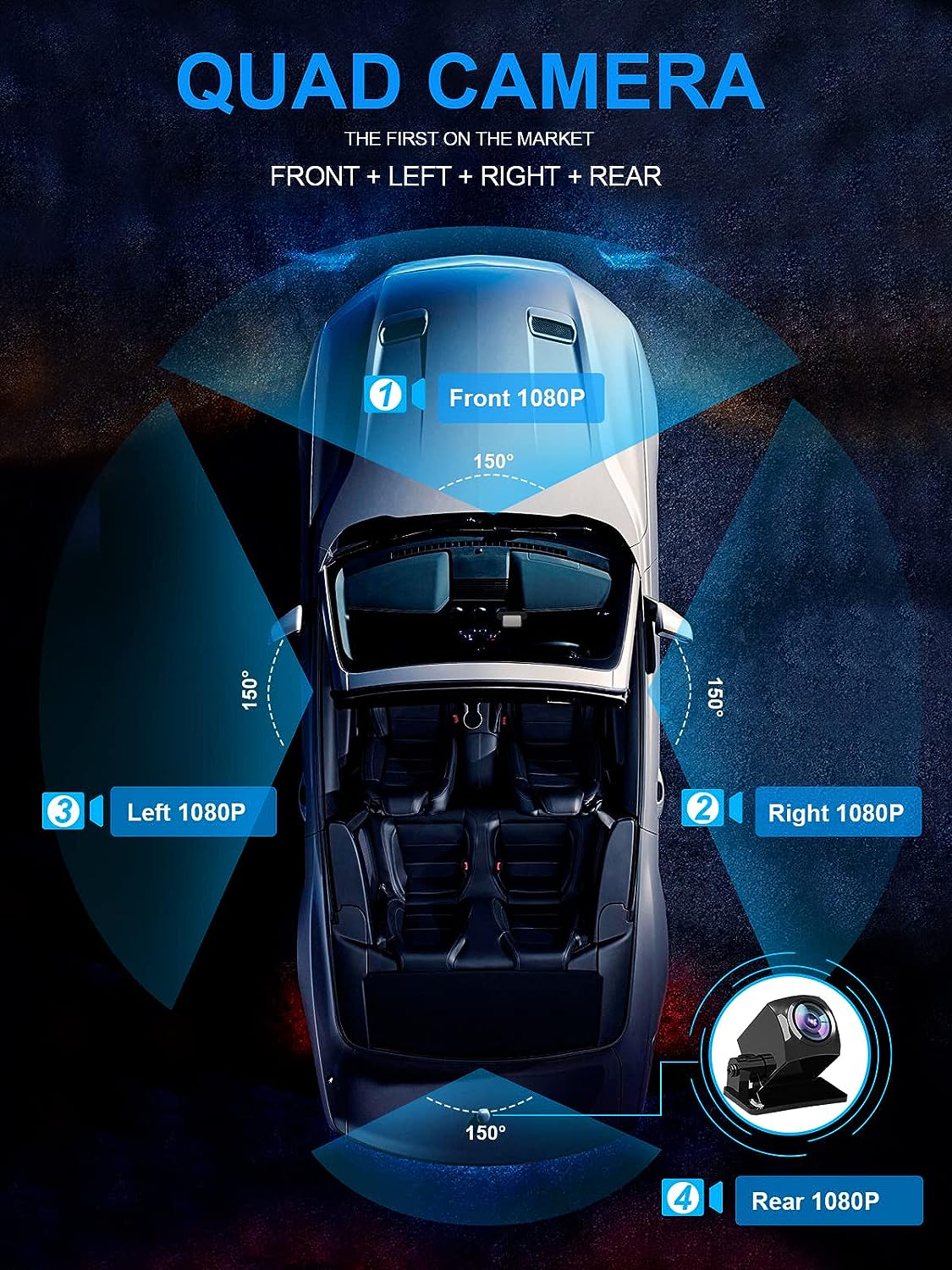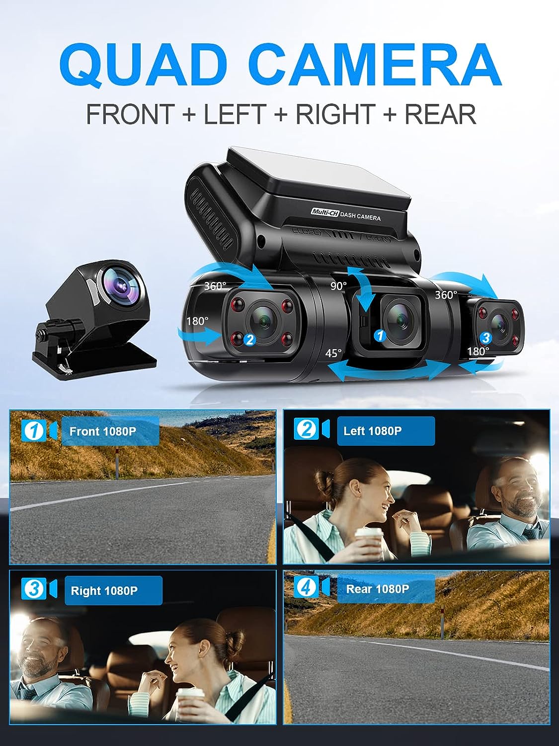 PRUVEEO Dash Cam, 4 Channel Camera FHD 1080Px4, Front, Left, Right and Rear, Front and Rear Inside, GPS, 256 GB Max, Free 128GB Micro SD Card, D90-4CH