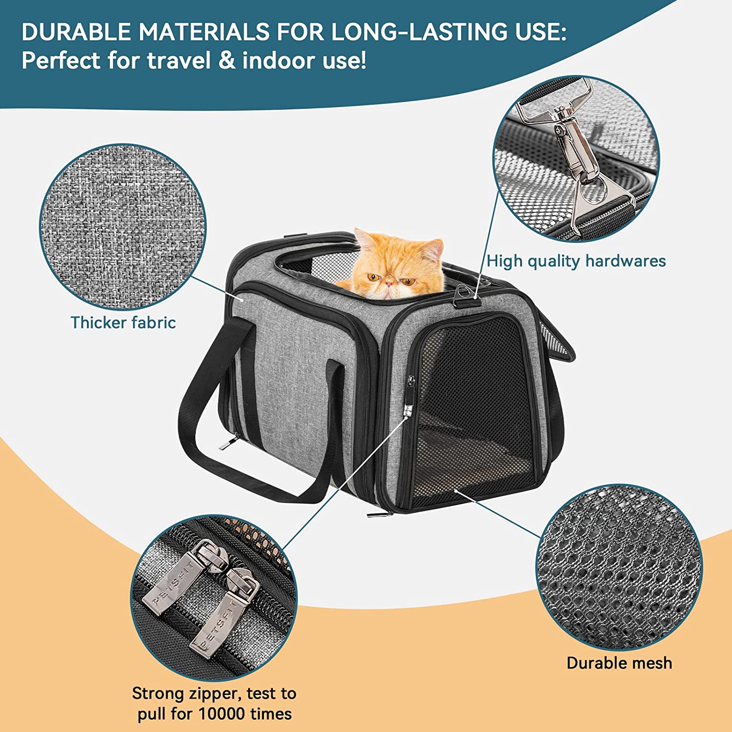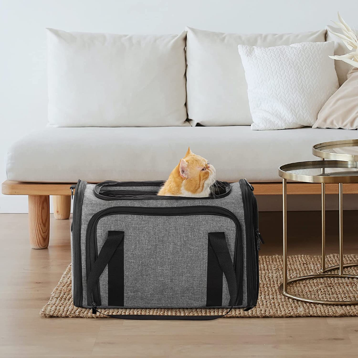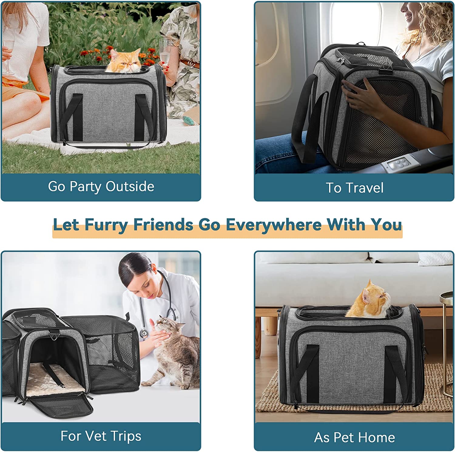 Petsfit Expandable Pet Carrier Airline Approved, Cat Carrier with Locking Zipper and Shoulder Strap, Storage Pockets, Cats, Kittens Puppies or Small Dog up to 20 Pounds,Gray M