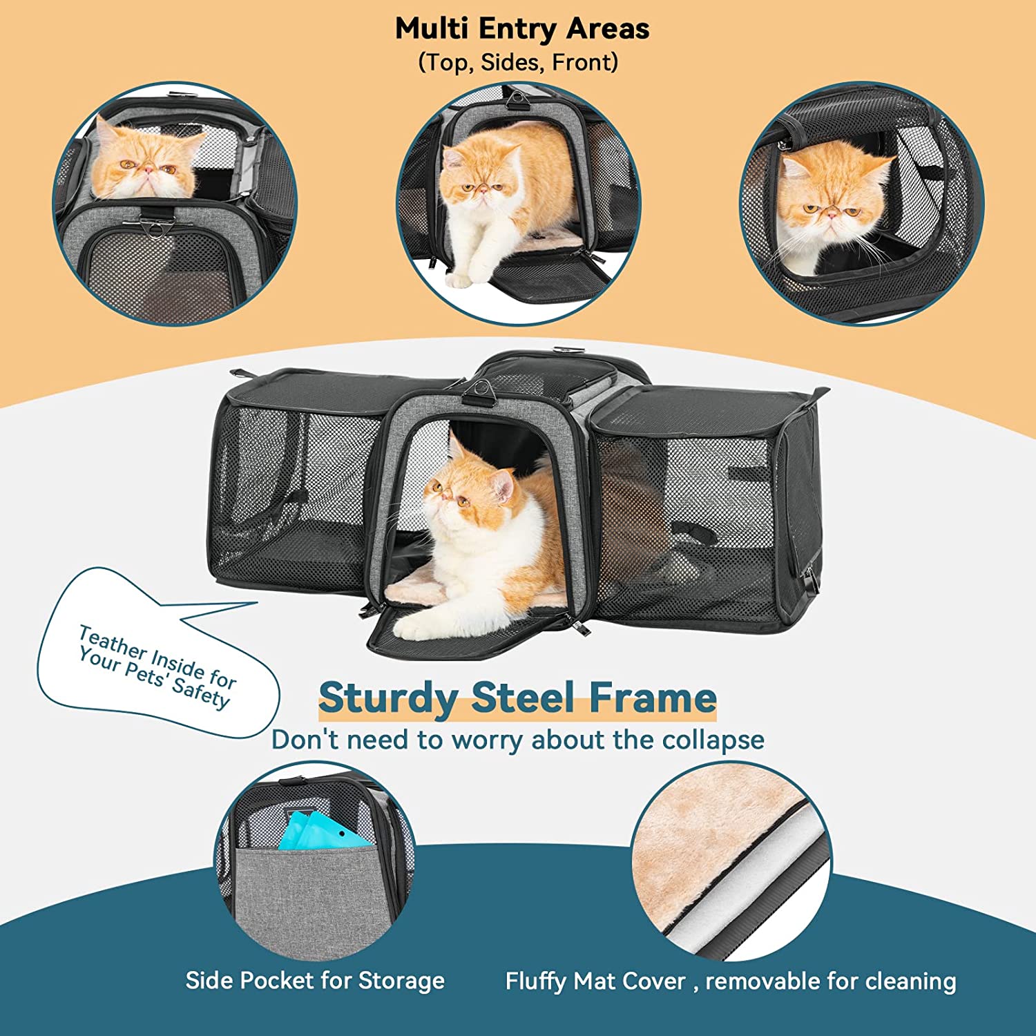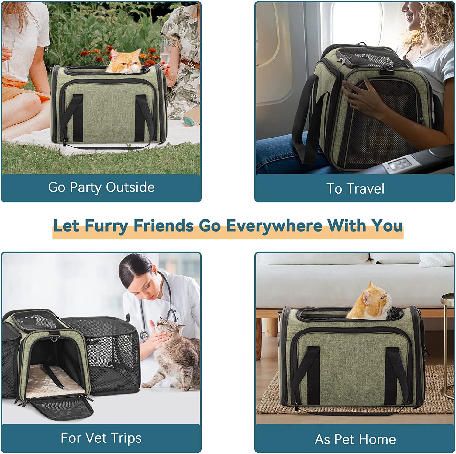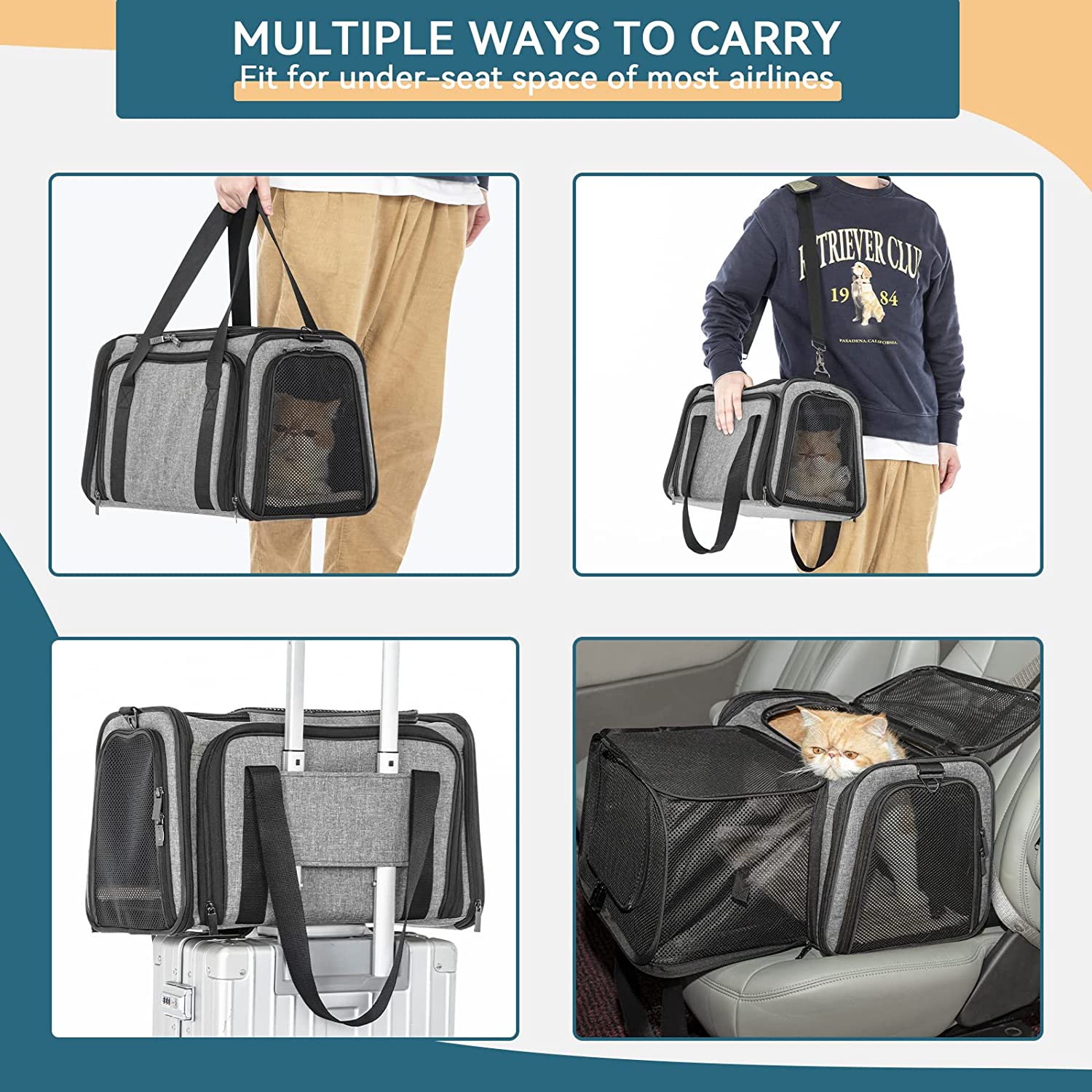 • FUNCTIONAL: The pet carrier airline approved 5 Entry and Exit channels increase their entertainment interest. The 2 Extensions are made of anti-scratch ventilated mesh, your pet can boldly play in it. The side bag can be used to store the "luggage" of your lovely furry baby . The lining of the bottom pad can come off and is washable. And the self-lock zipper to prevent your pets from escaping.
