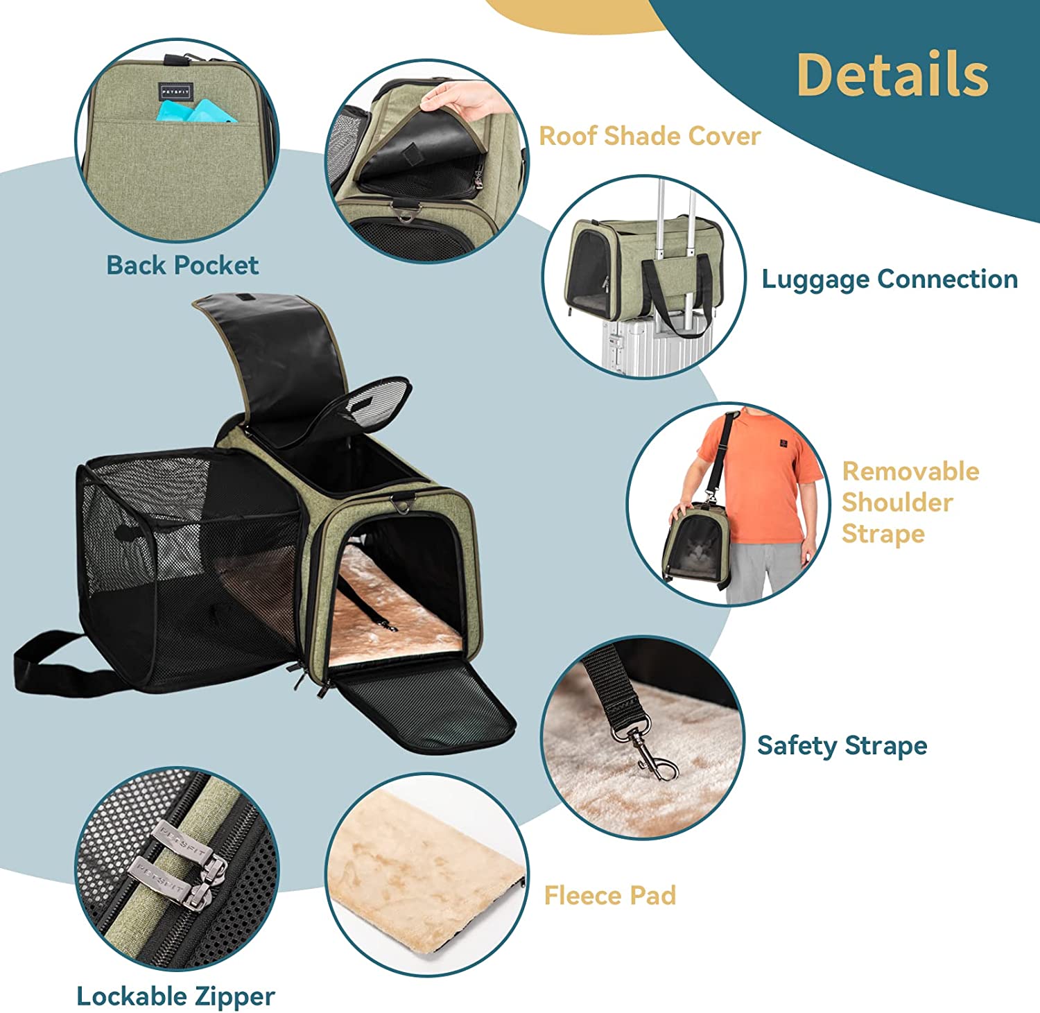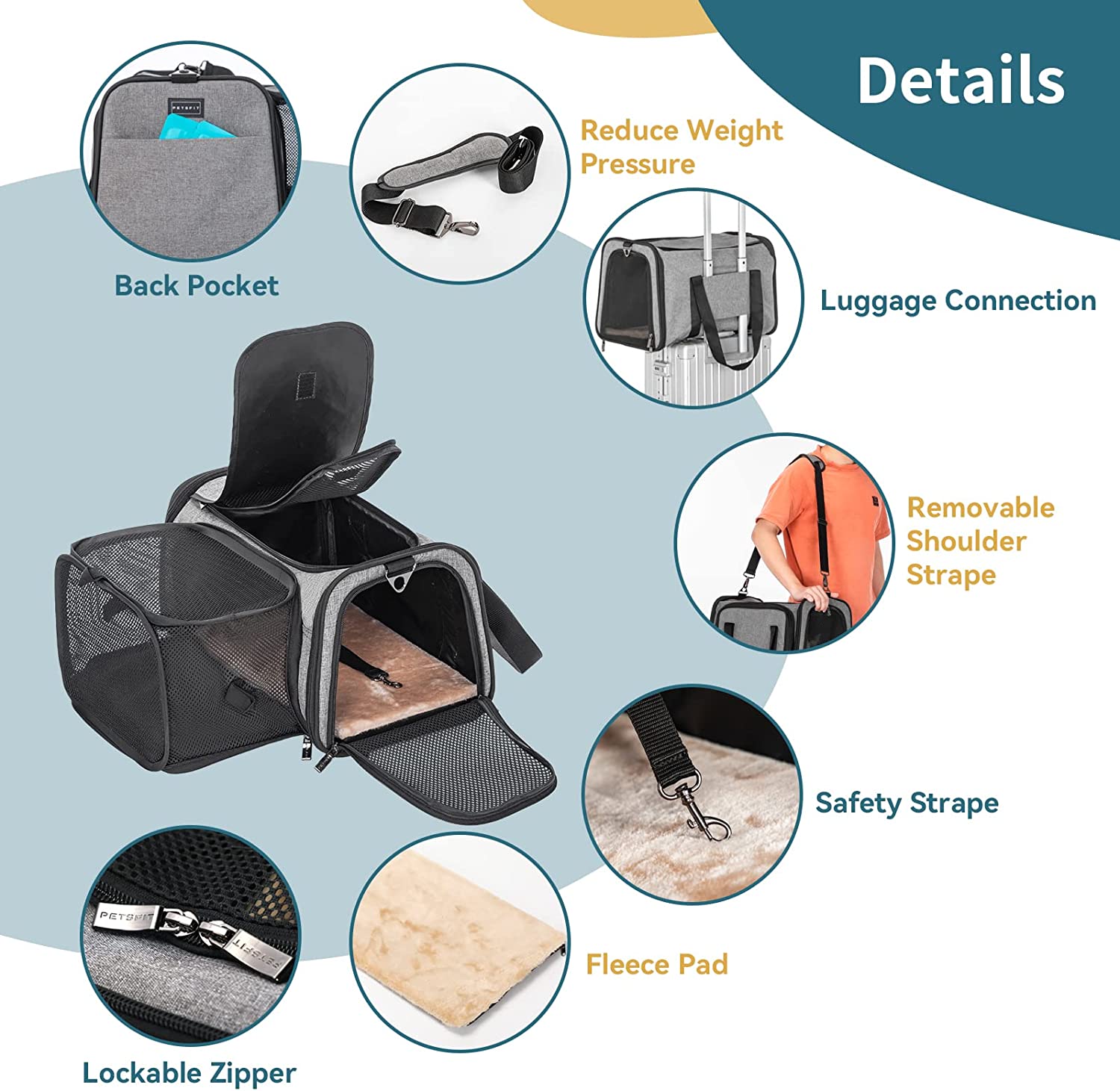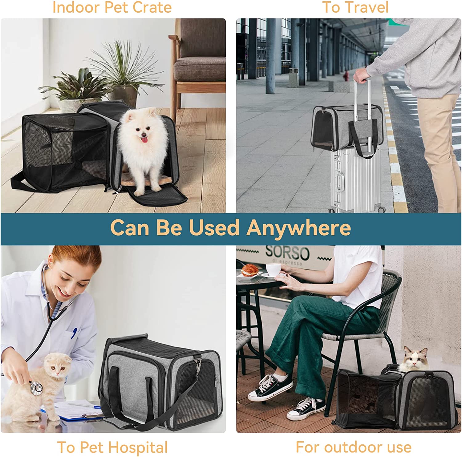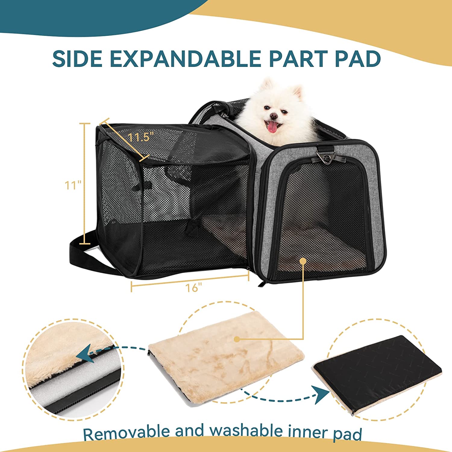 • FUNCTIONAL: The pet carrier airline approved 5 Entry and Exit channels increase their entertainment interest. The 2 Extensions are made of anti-scratch ventilated mesh, your pet can boldly play in it. The side bag can be used to store the "luggage" of your lovely furry baby . The lining of the bottom pad can come off and is washable. And the self-lock zipper to prevent your pets from escaping.