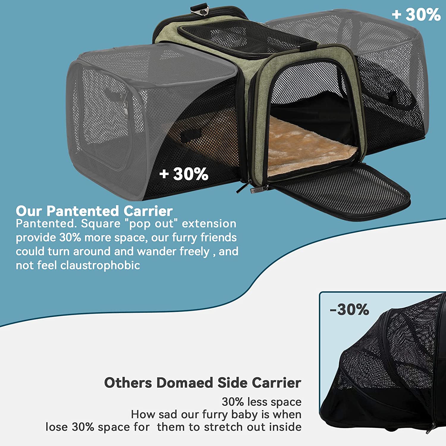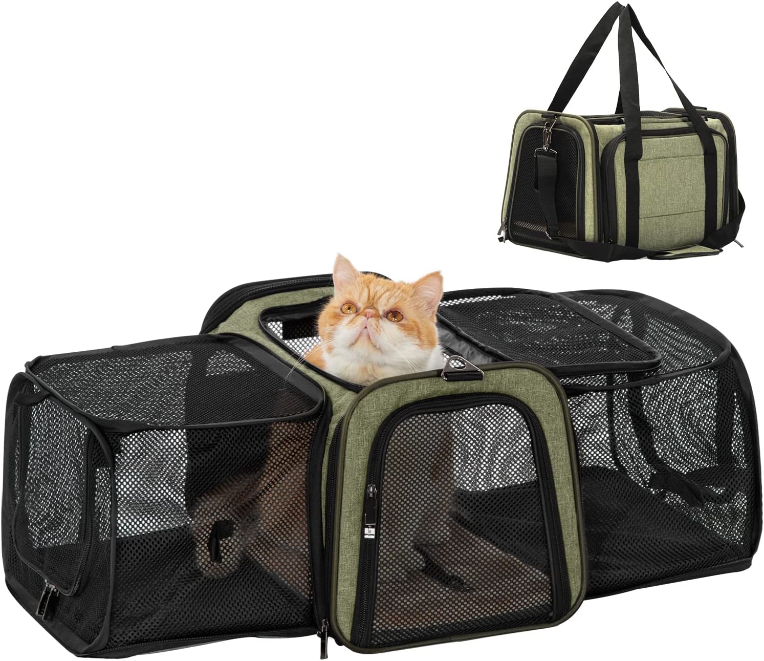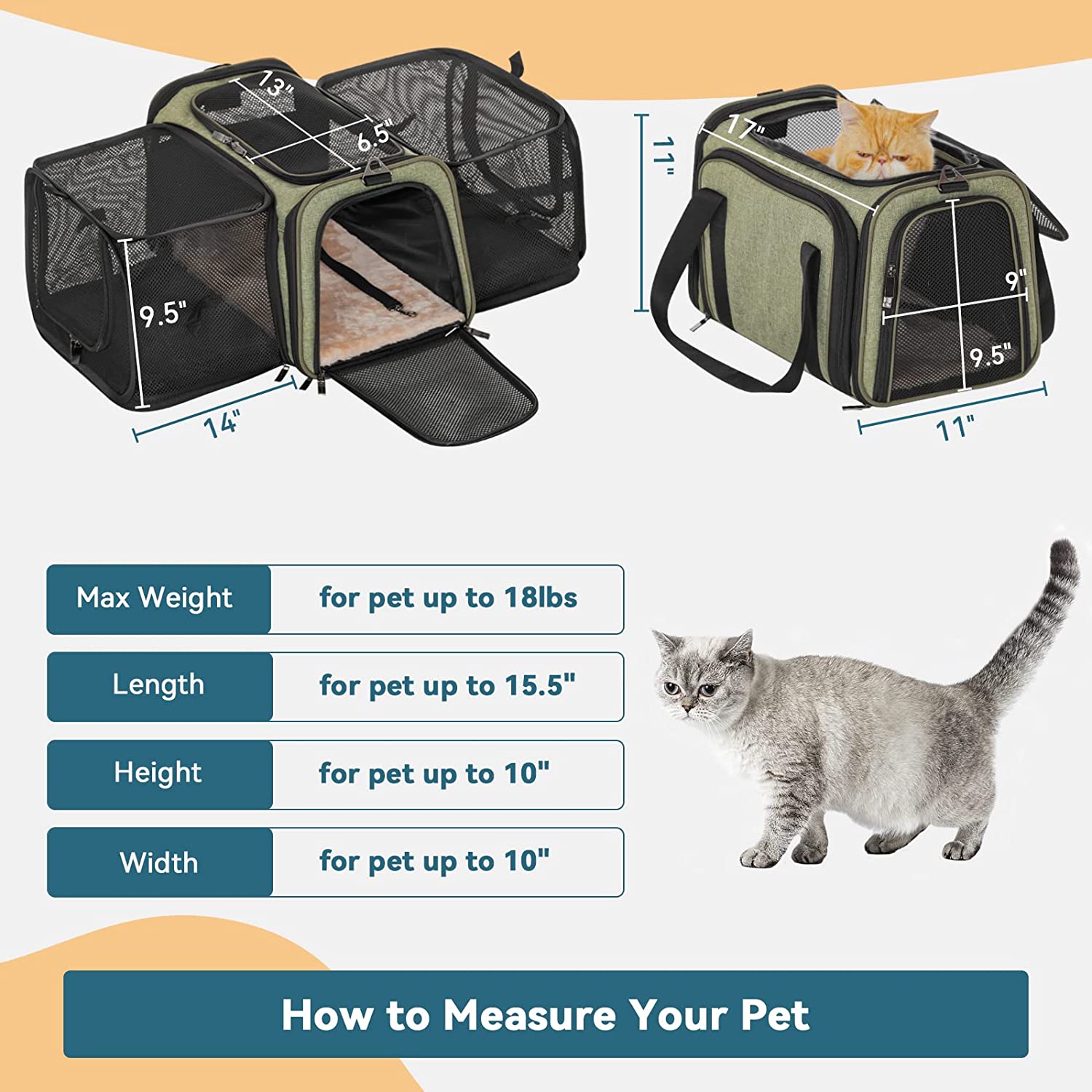 • Special Design of The Cat Carrier: When fully expanded the pet carrier your pet will enjoy a comfortable travel space, enough for pets to turn around. When closing expansion, the size: 17” x 11” x 11”conforms to most airlines.