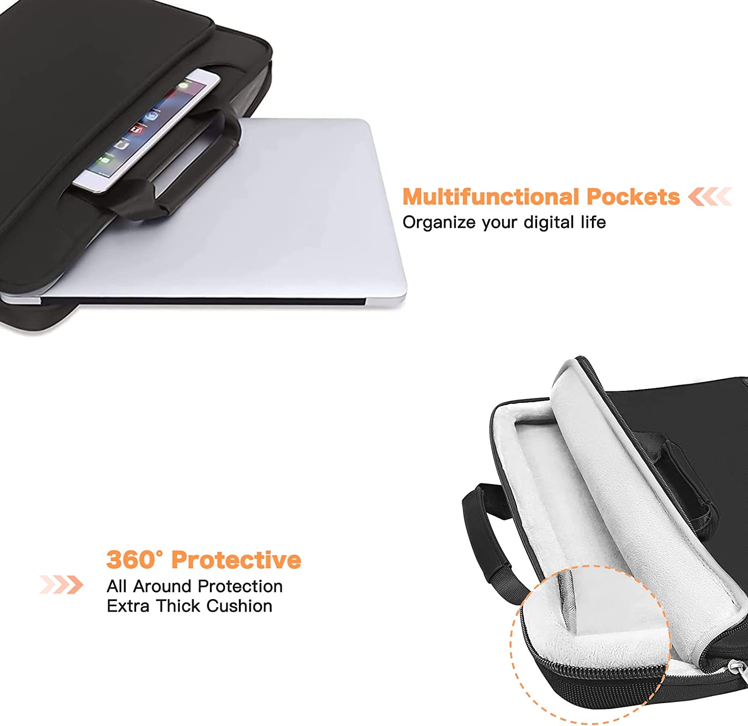 • 360 degree all around protective reinforced interior edge protect your laptop from any accidental dropping. Features foam padding layer and fluffy fleece fabric lining for bump and shock absorption and protection of your computer from accidental scratches. Top-loading double zippers on the bag glide smoothly and allows convenient access to your laptop computer.