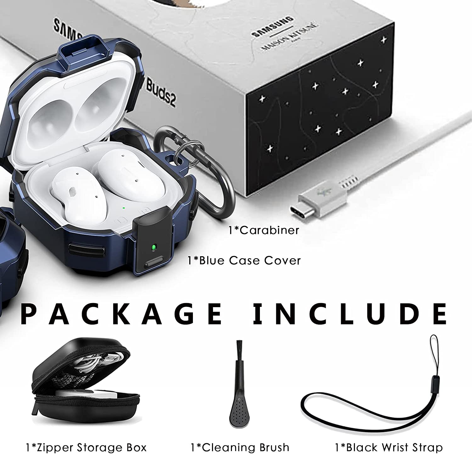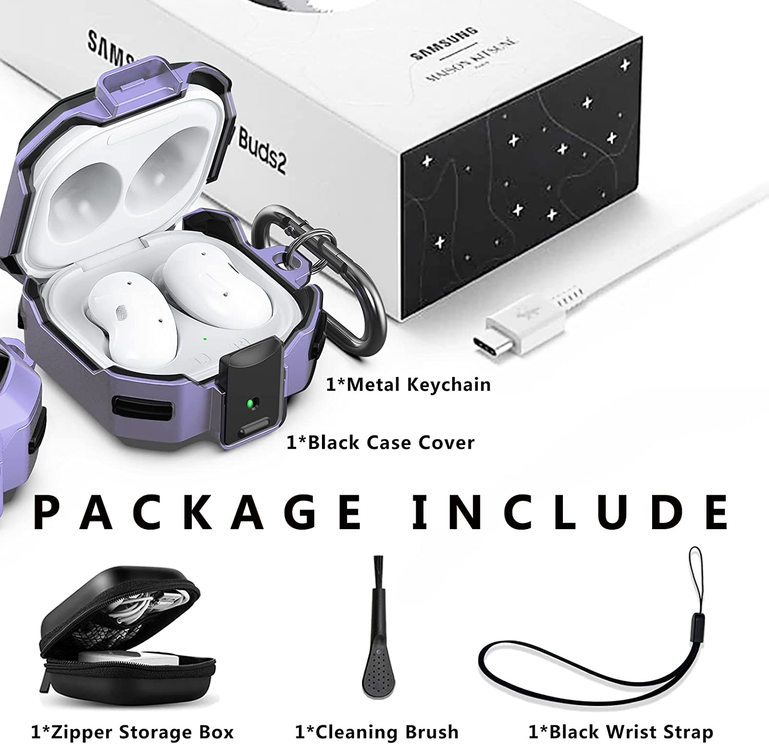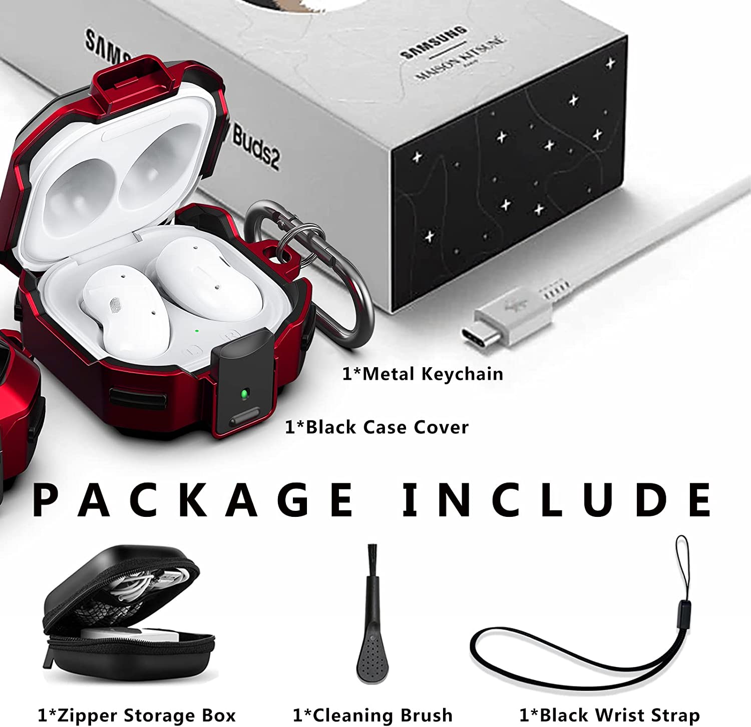 • ✔【With Accessories 】:This Samsung Galaxy Buds Live/Pro 2 case cover with a carabiner, wirst strap and cleaning brush.The carabiner can be hung on your belt, bag or key. You can use wirst strap to fix your Galaxy Buds Live/Pro/2 on your wrists to prevent it from falling when you are doing outdoor sports. The cleaning brush is clean the dust and dirt in the internal crevices of the Galaxy Buds Live/Pro/2 charging case.