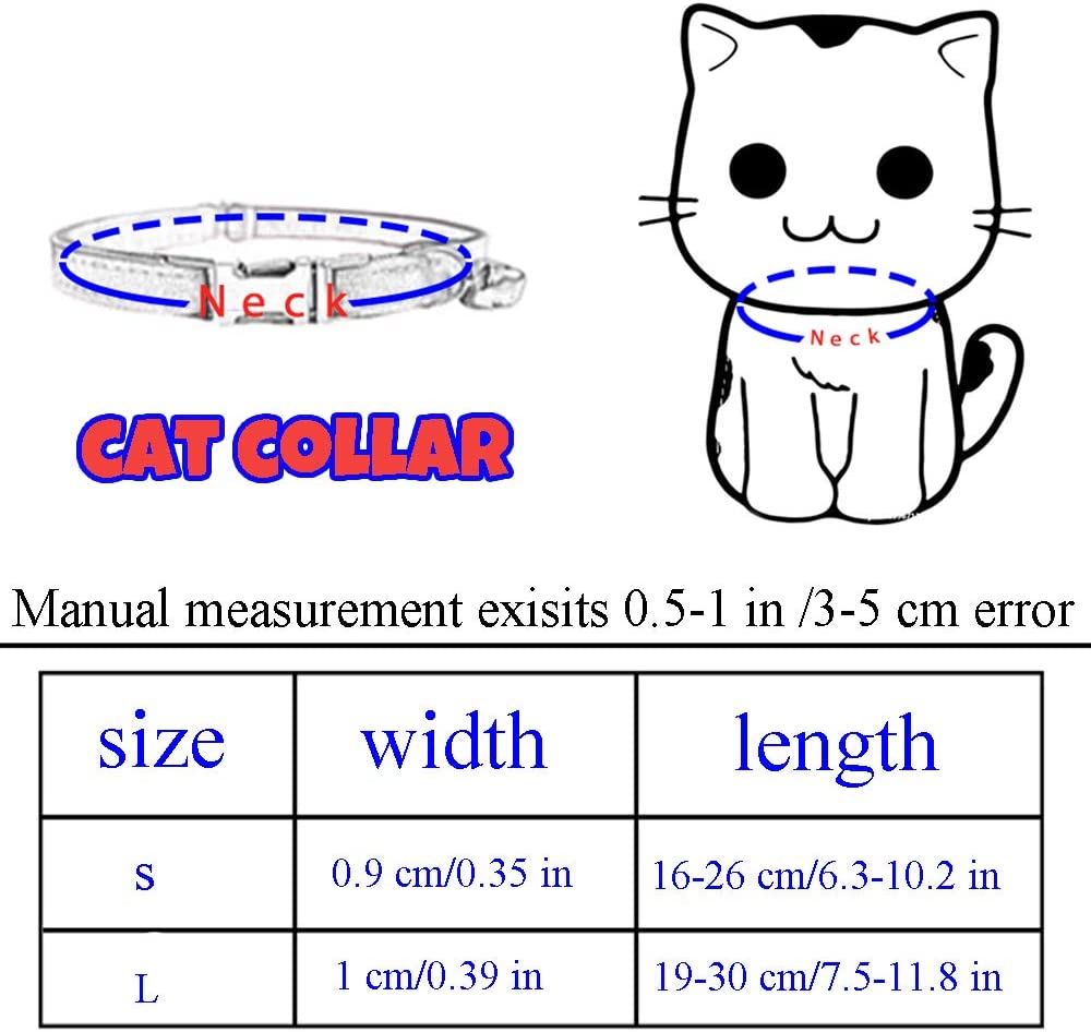 • Adjustable 2 Size--S: 6.3''-10.2'' and L : 7.5''-11.8'' ,fits most cats. Please measure your cat's neck or current collar before ordering. Manual measurement exisits 0.5"-1" error.