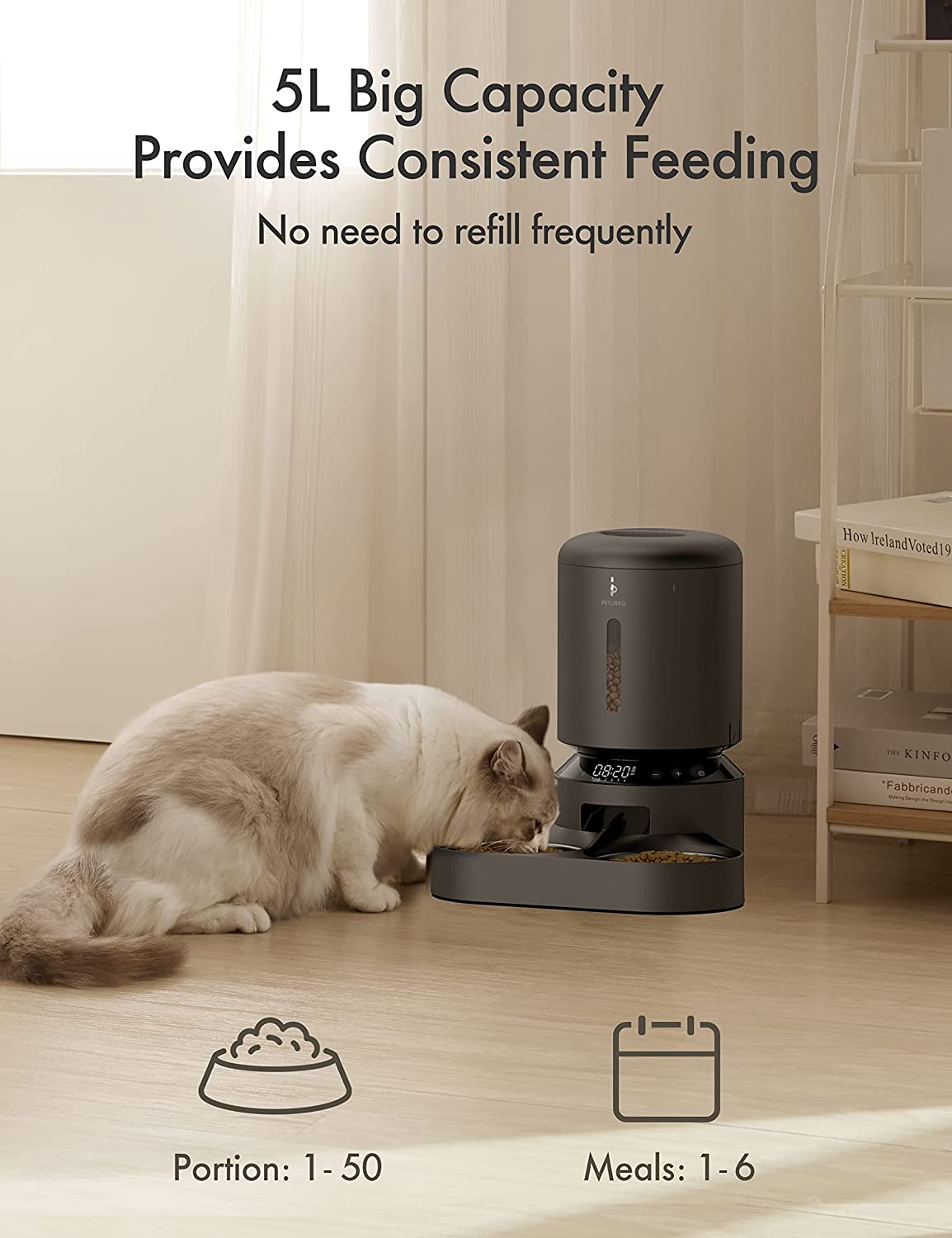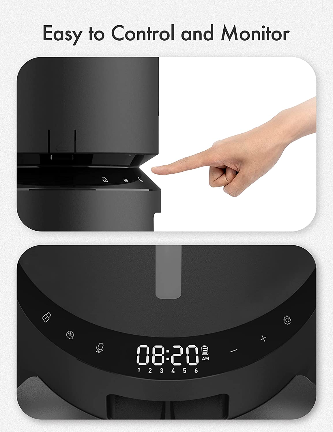 • Easy to Set up and Program: PETLIBRO timed cat feeder can set 1-6 meals daily and up to 50 portions per meal (20ml each portion). Use the easy-to-read tilt LED panel to adjust your pet's feeding schedule and monitor battery power. The Granary auto cat feeder is also equipped with a manual feeding button to easily reward your pet (up to 5 portions).
