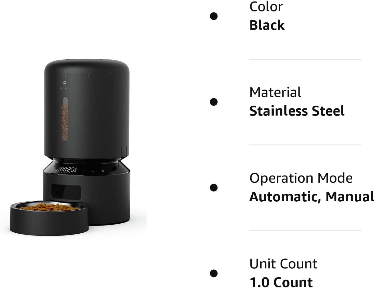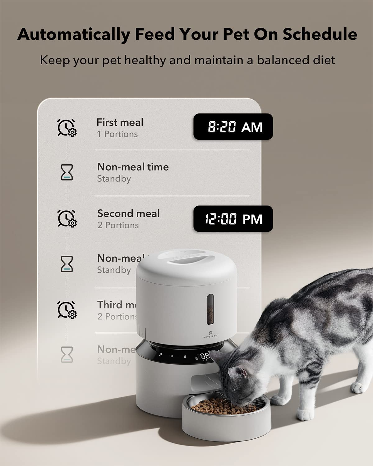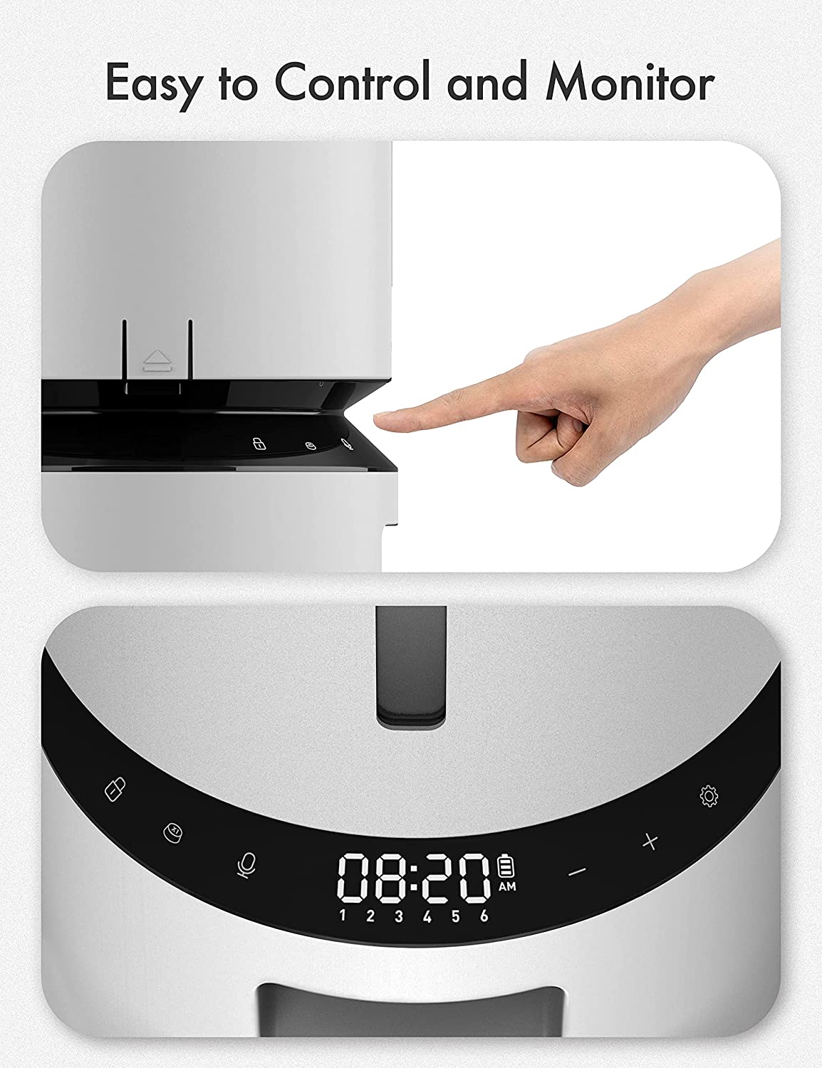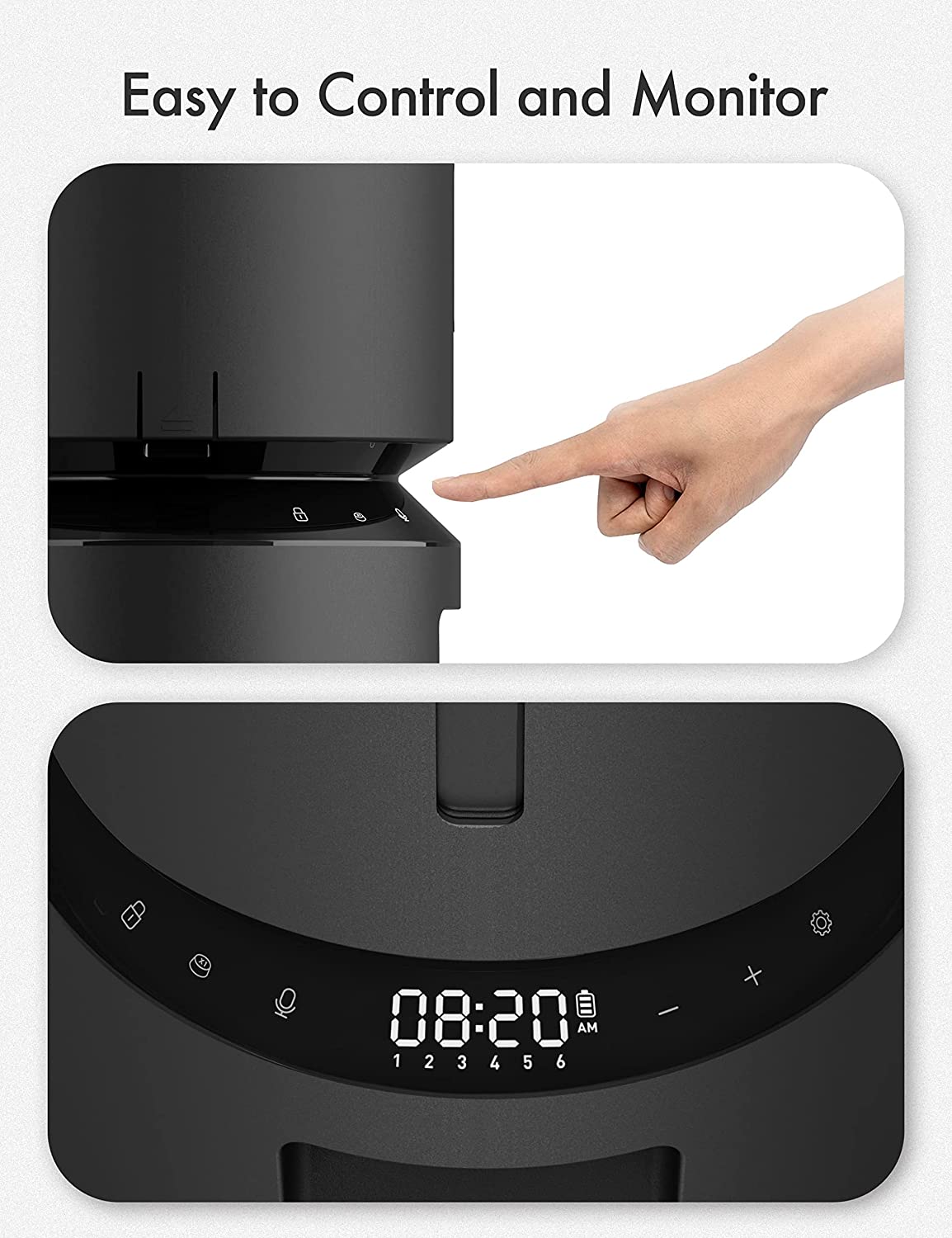 • Easy to Set up and Program: PETLIBRO timed cat feeder can set 1-6 meals daily and up to 50 portions per meal (20ml each portion). Use the easy-to-read tilt LED panel to adjust your pet's feeding schedule and monitor battery power. The Granary auto cat feeder is also equipped with a manual feeding button to easily reward your pet (up to 5 portions).