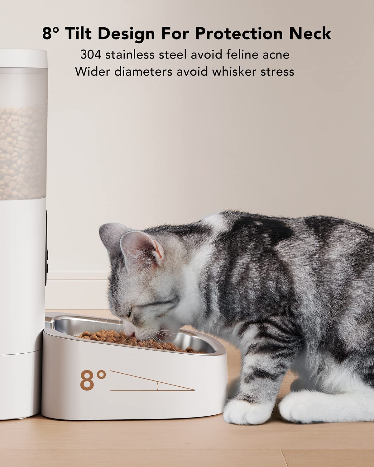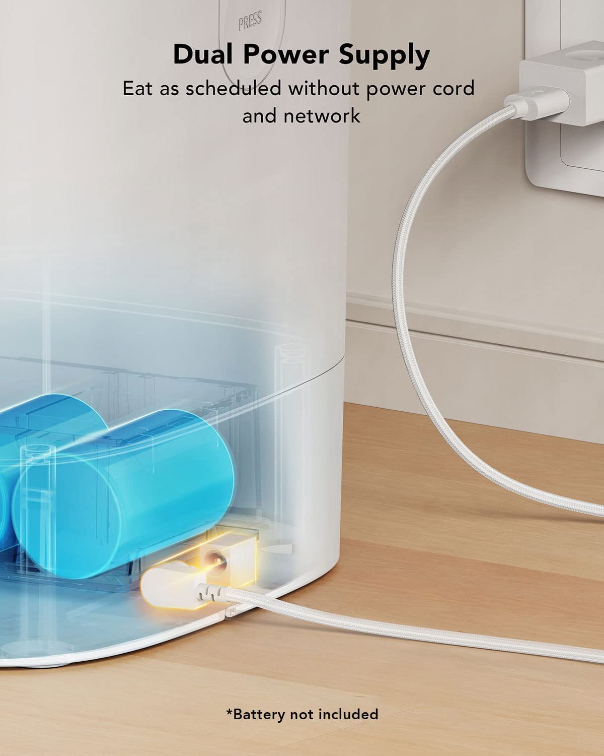• Dual Power Supply: Use the 5V DC adapter while sustaining the auto cat feeders power via 3 alkaline D-cell batteries(not included) installed in case of power outages, ensure that your pet gets food consistently. (Equipped with setting memory to prevent sudden power failure)