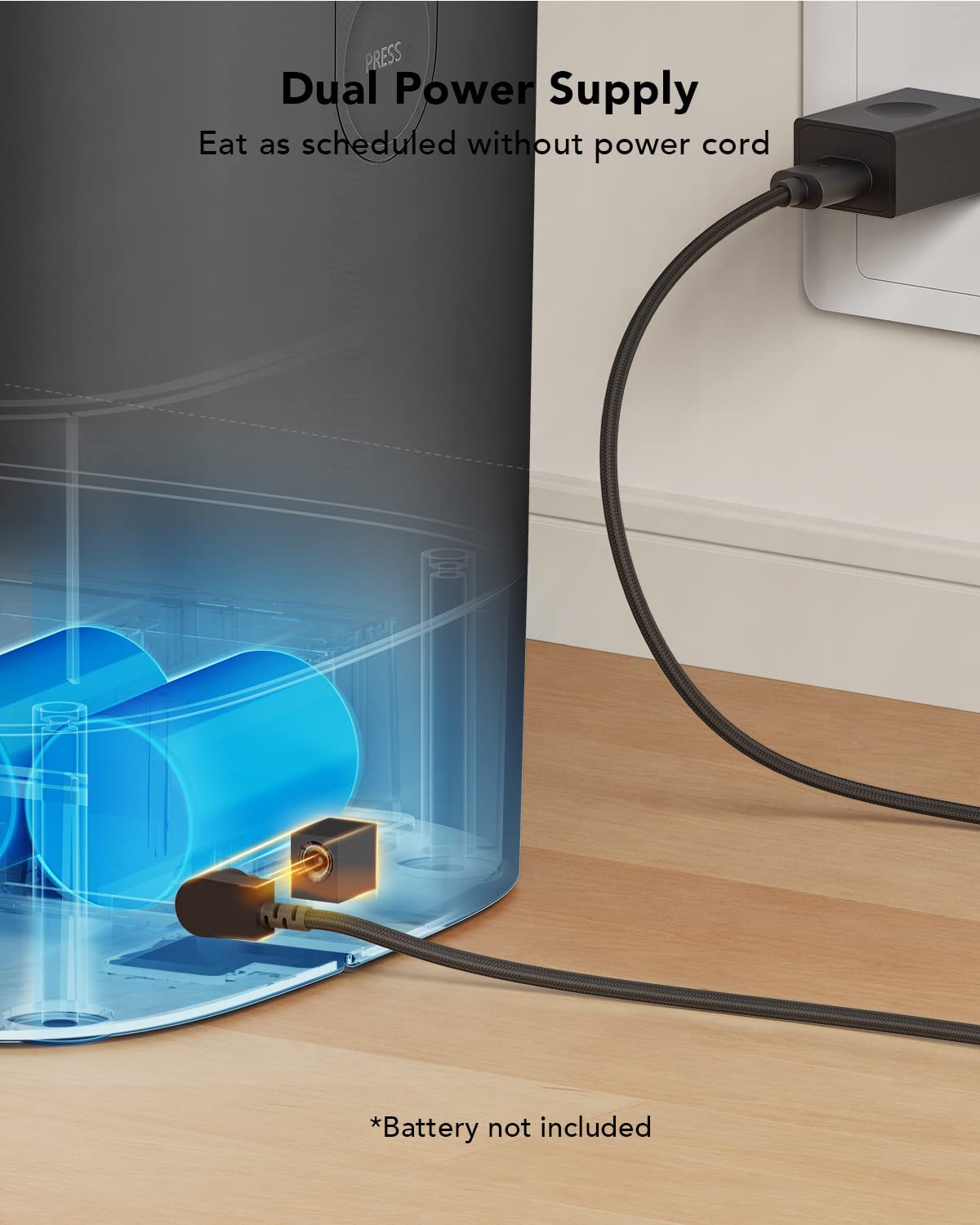 • Dual Power Mode: Use the DC 5V adapter to power the automatic pet feeder. Alternatively, install three backup alkaline D batteries (not included) for peace of mind during a power outage. (Equipped with setting memory to prevent sudden power failure)