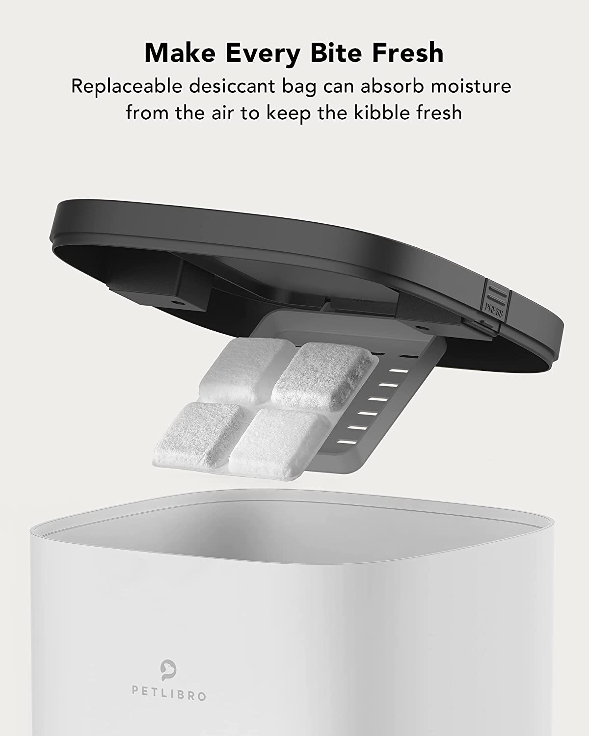 • Freshness in, Cats out: The PETLIBRO Dog Food Dispenser has a secure top lid that prevents cats from accessing the food and keeps air out to maintain freshness. Search for "B08NVBYQHV" to buy replacement desiccant bags.