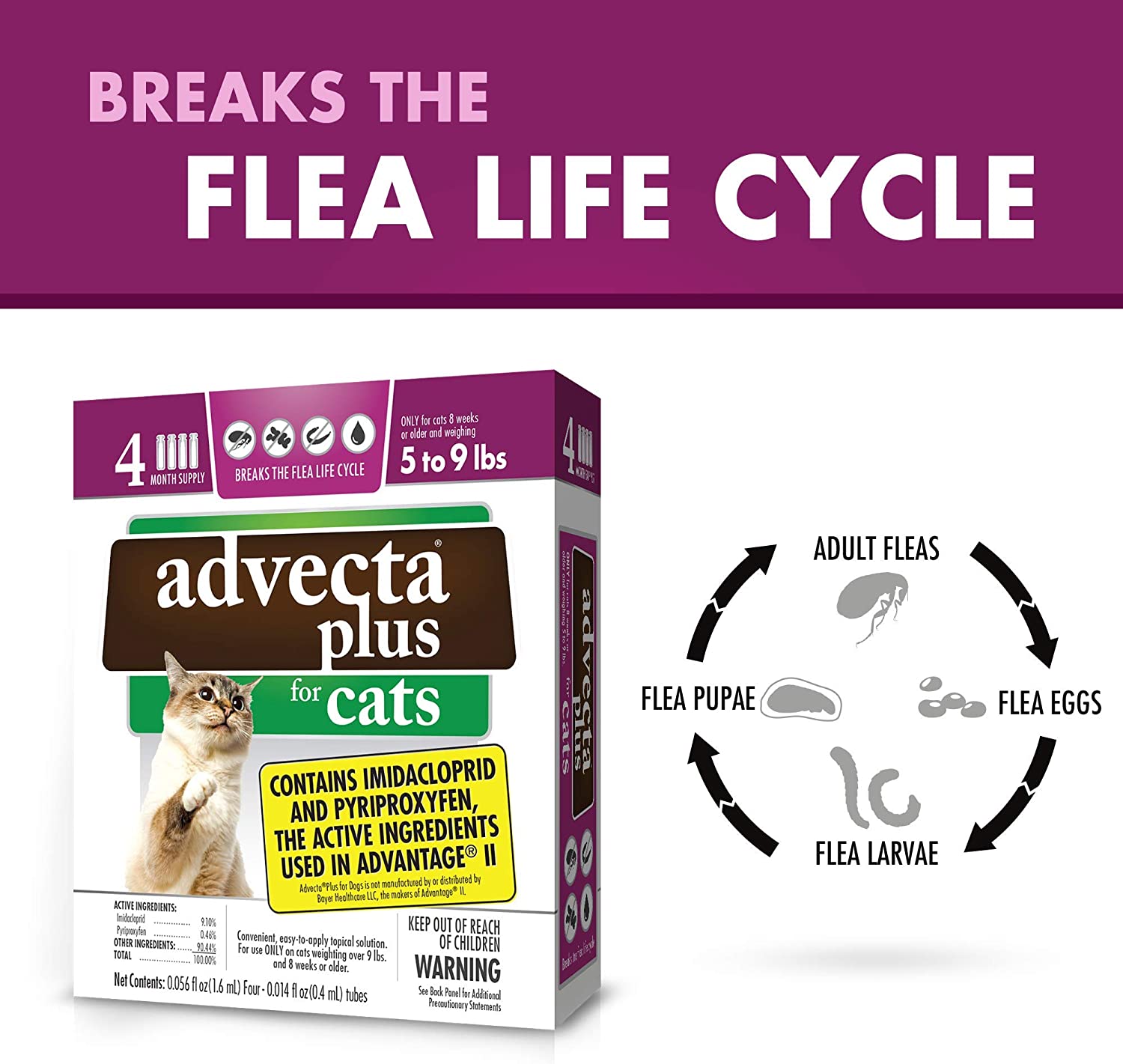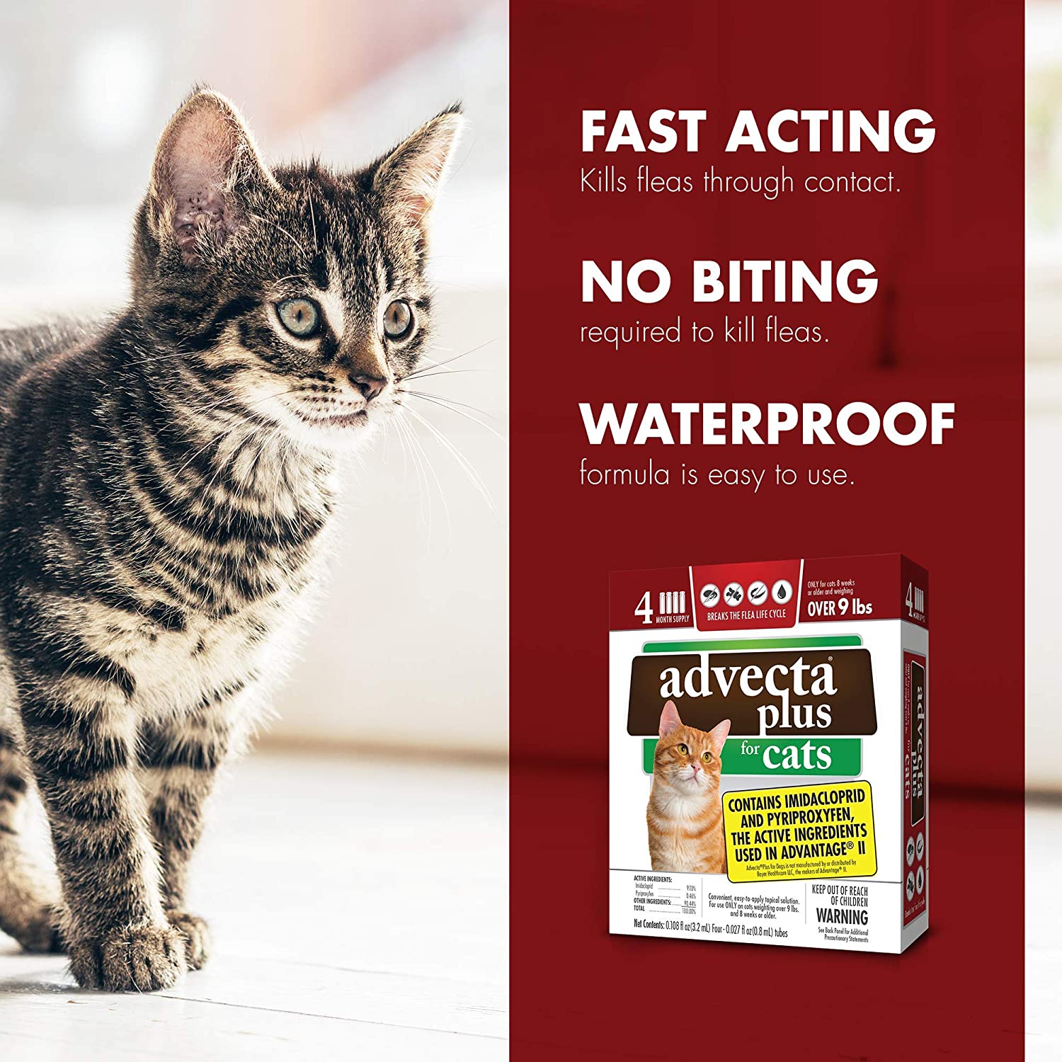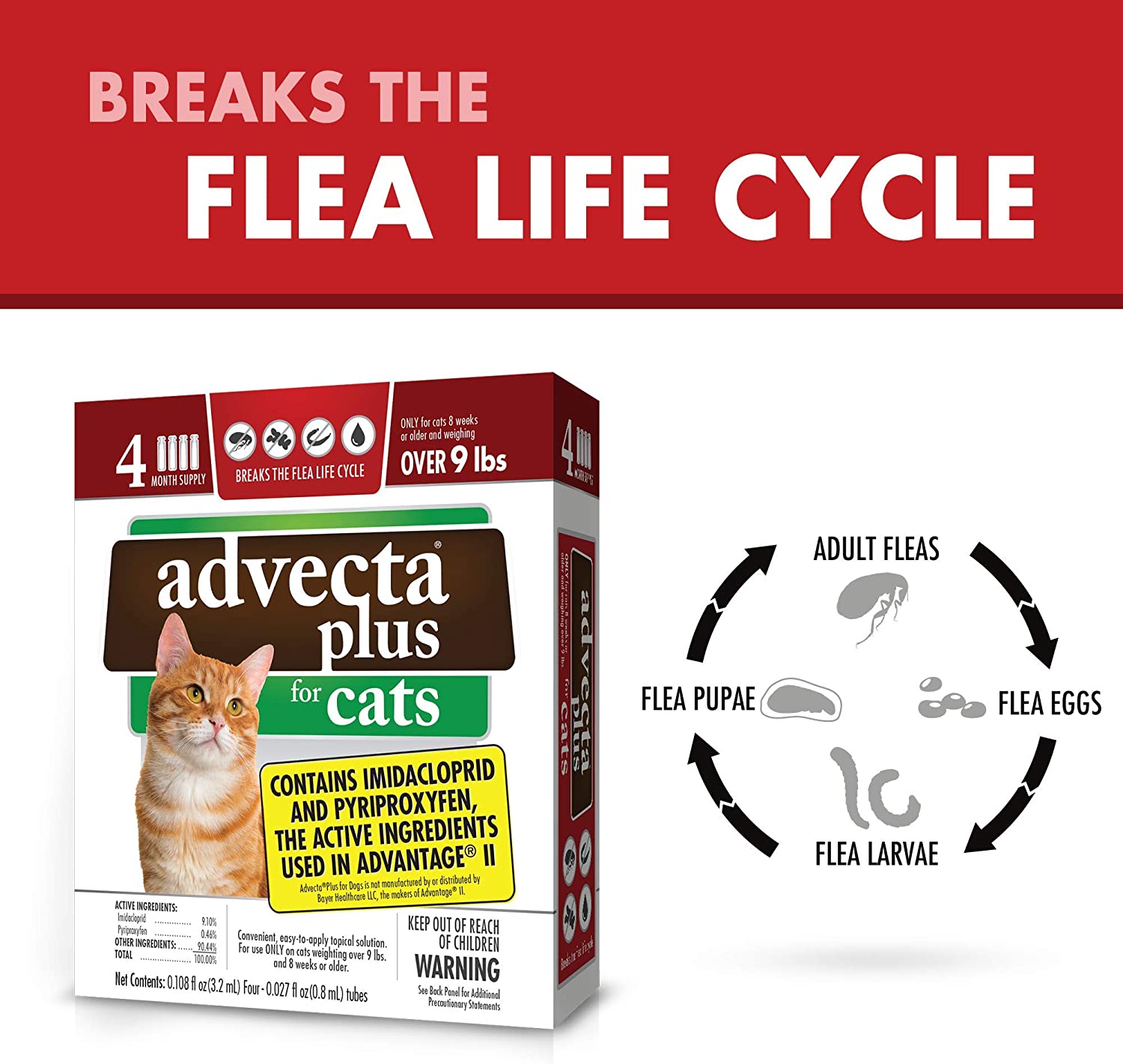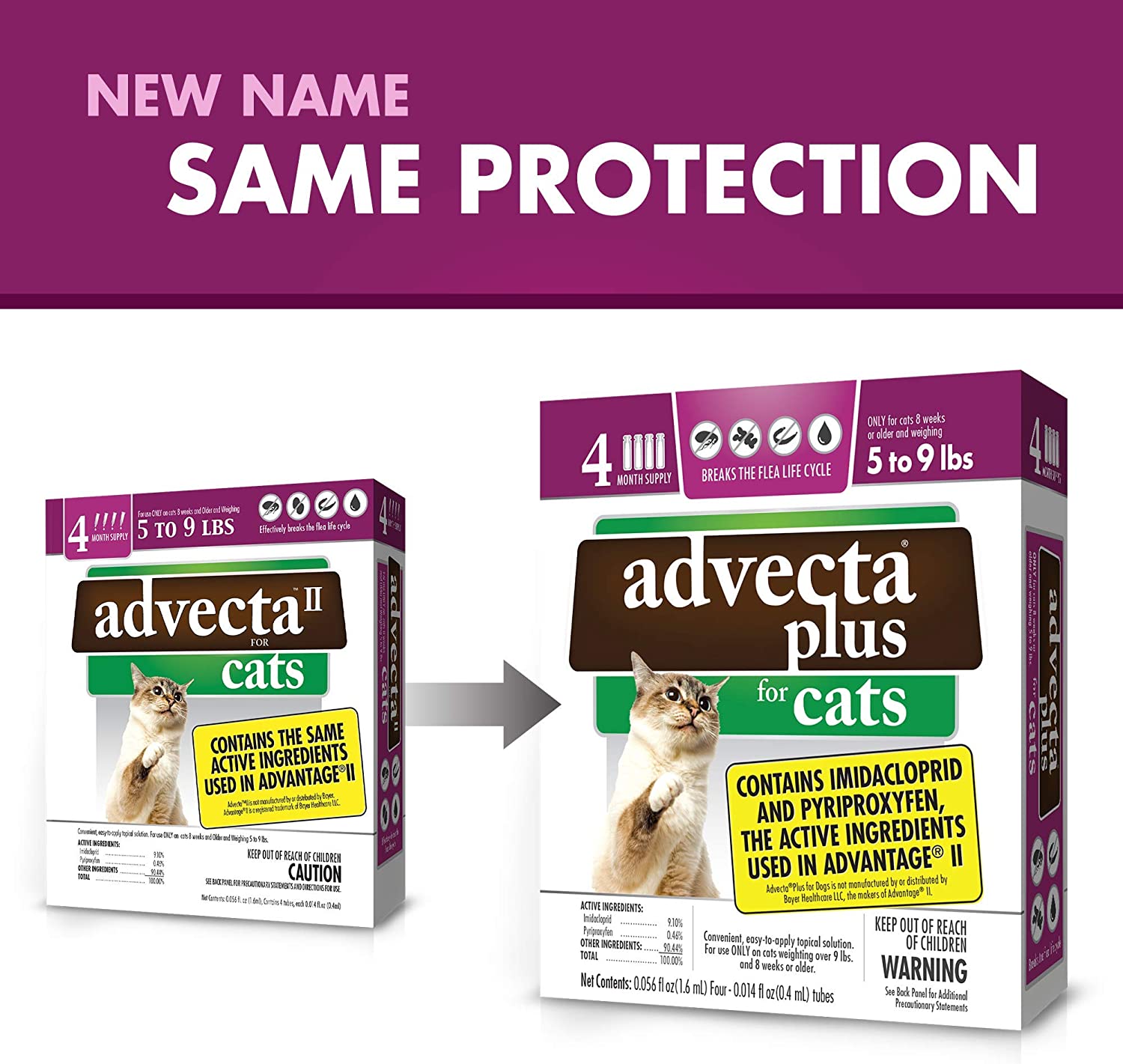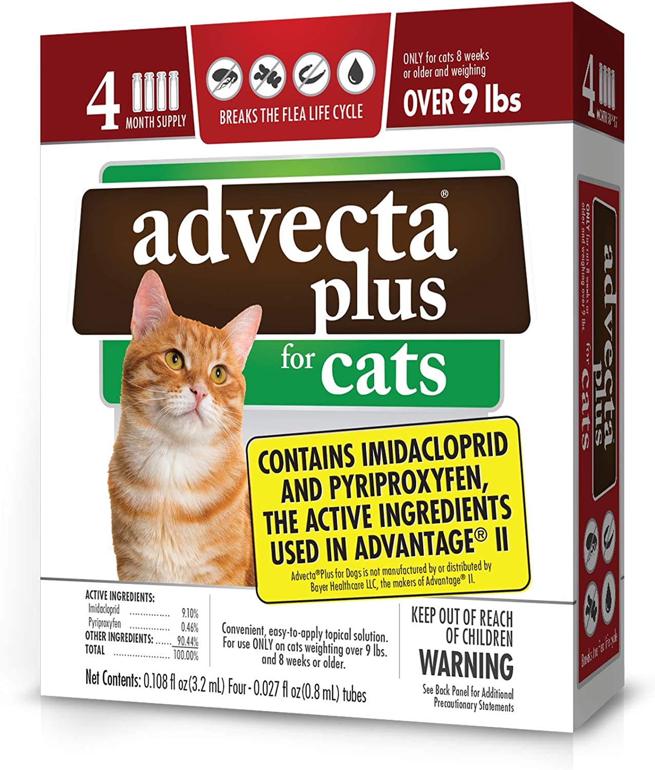 Advecta Plus for Cats (9lbs and Over) contains the same active ingredients used in Advantage II for Cats. Advecta II is a convenient, easy-to-apply topical solution for the prevention and treatment of fleas on cats 8 weeks of age and older. Kills fleas on cats within 12 hours of application and continues to prevent reinfestations for up to 4 weeks. This flea treatment is a waterproof, fragrance-free formula