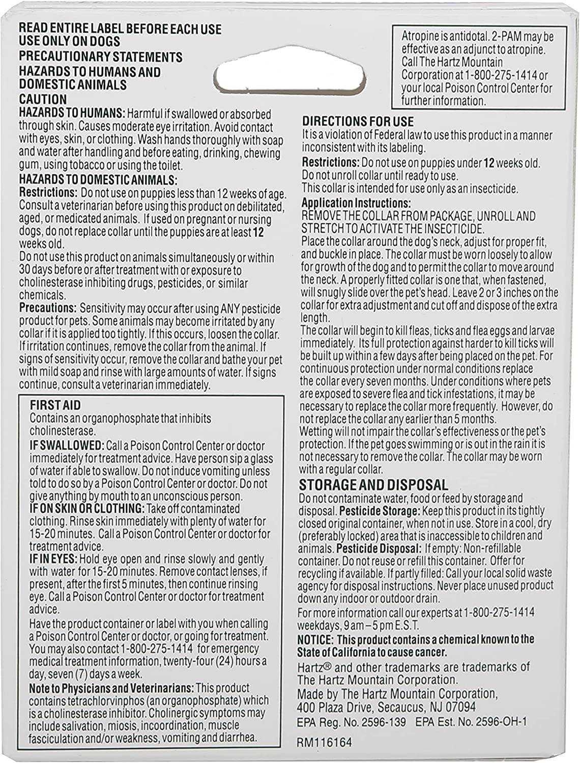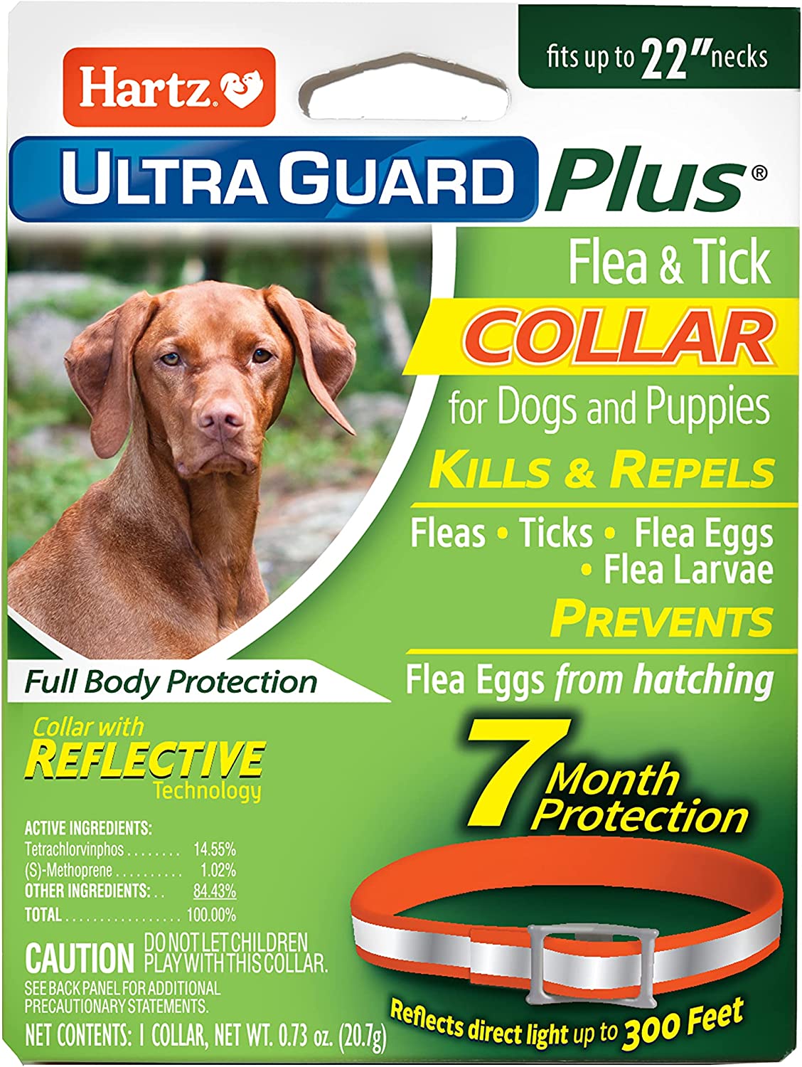 Tell pesky parasites to ‘bug off’ with the Hartz UltraGuard Plus Orange Reflective Flea & Tick Collar for Dogs & Puppies. This bright orange collar kills and repels both fleas and ticks on pups with necks up to 22 inches for 7 months, and also prevents flea eggs from hatching for over half the year - stopping the flea life cycle and inhibiting reinfestation. The water resistant design remains effective even after getting caught in the rain. Additionally, the Reflect-X Shield reflects direct light for up to 300 feet for an added dimension of nighttime safety. For continuous flea and tick protection from head to tail, replace the collar every 7 months. For use on puppies 12 weeks of age and older. Directions: Remove collar from package, unroll and stretch to activate insecticide generator. Do not use on puppies under 12 weeks of age. Do not unroll collar until ready to use. Place the collar around the dog’s neck, adjust for proper fit and buckle in place. The collar must be worn loosely to allow for growth of the dog and to permit the collar to move about the neck. Generally, a properly fitted collar is one that, when fastened, will snugly slide over the dog’s head. Leave 2 or 3 inches on the collar for extra adjustment and cut off and dispose of the extra length. Consult a veterinarian before using this product on debilitated, aged or medicated pets. Sensitivity may occur after using any pesticide product for pets. Some animals may become irritated by the collar if it is applied too tightly. If this occurs, loosen the collar. If irritation continues, remove the collar and bathe your dog with mild soap and rinse with large amount of water. If signs continue, consult a veterinarian immediately. Do not use this product on dogs simultaneously or within 30 days before or after treatment of other flea and tick products. However, flea and tick collars may be replaced immediately.