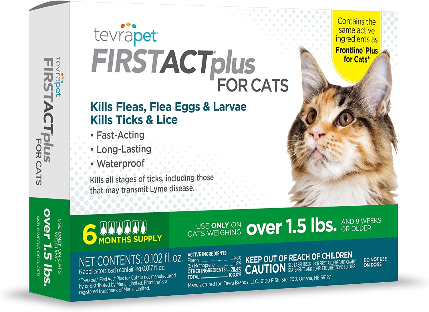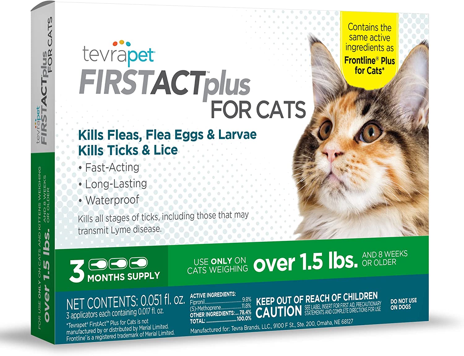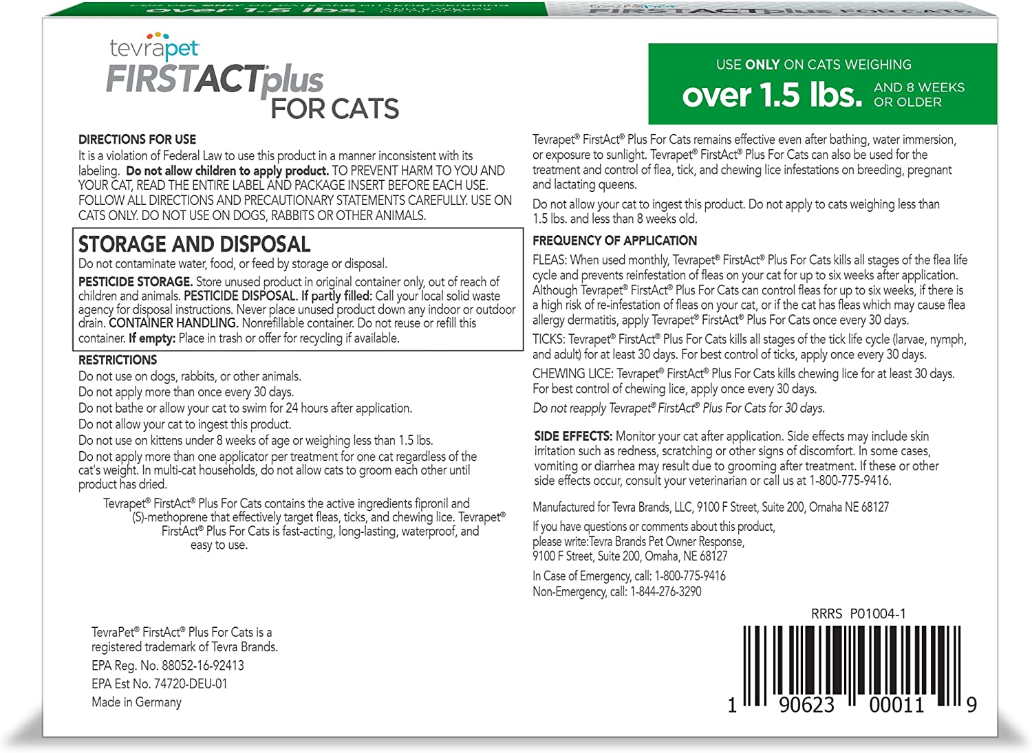 TevraPet first Act Plus for cats kills fleas, flea eggs and larvae, and chewing lice. It kills all stages of ticks including those that may transmit Lyme disease, and aids in the control of sarcoptic mange. First Act Plus contains the same active ingredients (fipronil + (S)-methoprene) as Frontline Plus for cats. This formula is waterproof, No need to reapply after swimming or bathing. The package includes 3 applicators, each good for 1 month of protection. Apply this product monthly for up to 3 months of protection for your pet and household. Application instructions part The hair on the neck at the BASE of the skull until the skin is visible. Place the tip of the applicator on the skin and squeeze the applicator to apply the entire contents directly on the skin of your cat. Do not allow your cat to ingest this product, or get the product into their eyes. Proper placement of the product on your cat will minimize the opportunity for the cat to lick and ingest the product. Carefully avoid allowing the product to run off the side of the cat. Discard empty applicator and packaging as described in the storage and disposal section. Made in Germany EPA to no. 88052-16-92413