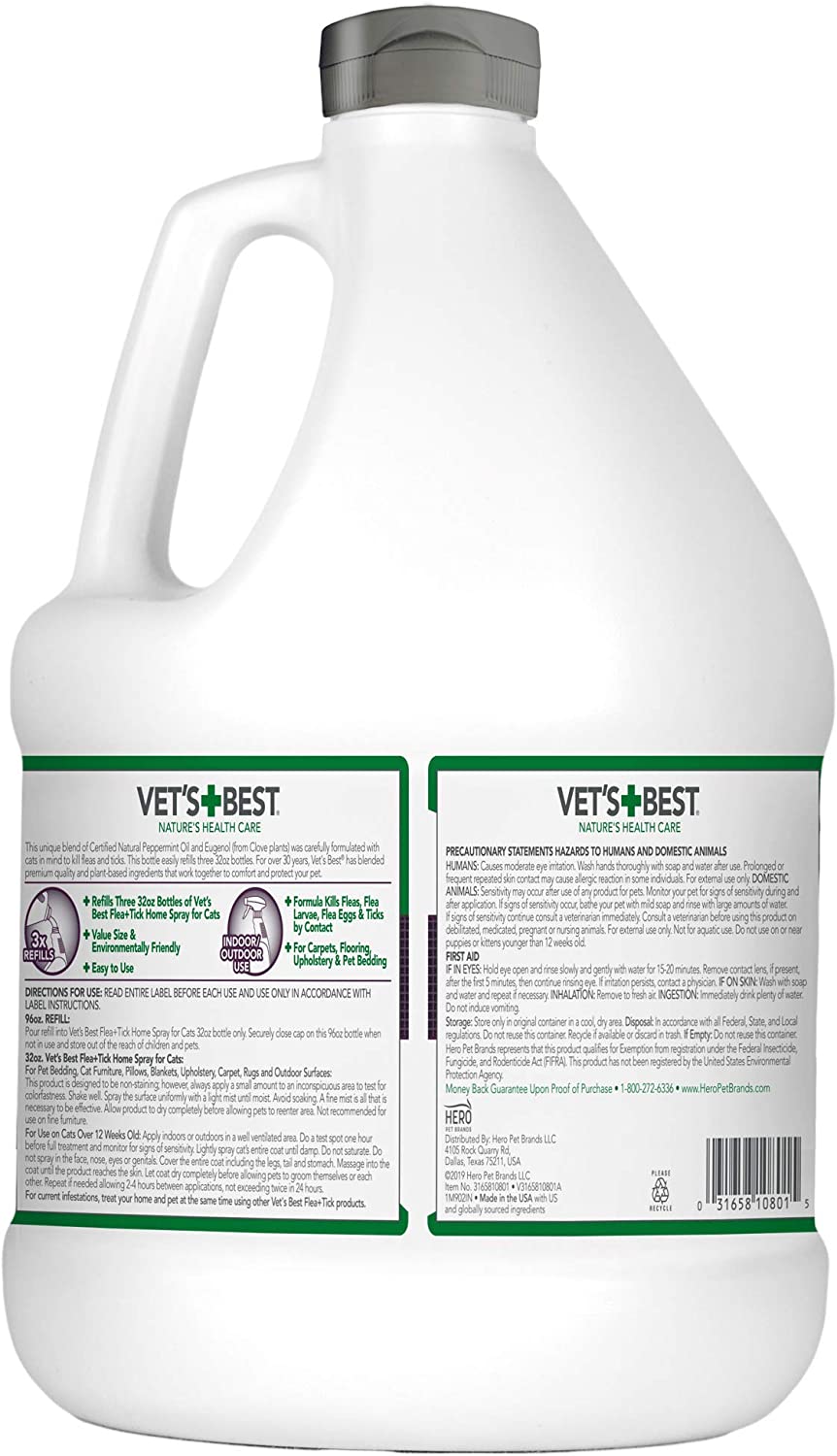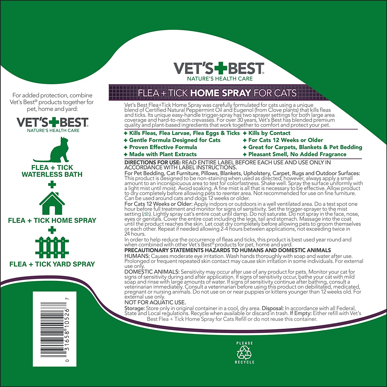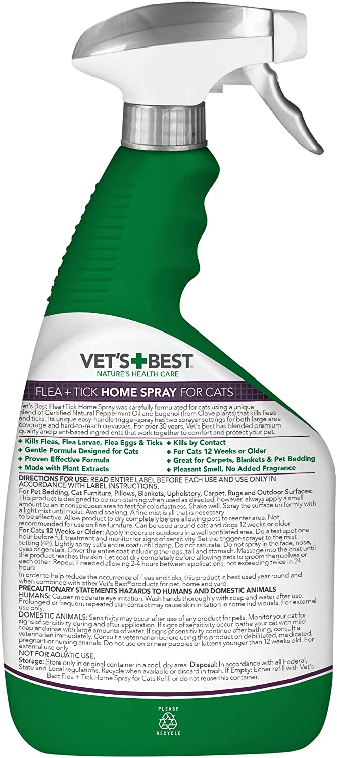Introducing the ultimate solution for pesky flea and tick infestations with our highly effective Vet's Best Flea and Tick Easy Spray! Made in the USA, our veterinarian formulated spray is designed to combat fleas, flea larvae, flea eggs, and ticks with ease. With certified natural ingredients like peppermint oil and eugenol, you can protect your cat without worrying about harsh chemicals. Not only does our flea and tick spray for cats eliminate current infestations, but it also helps prevent future ones. And the best part? Our flea spray is safe for home use as it won't leave any stains on your furniture! So, say goodbye to the endless itching and scratching and hello to a comfortable, pest-free home with our flea and tick spray for home use.