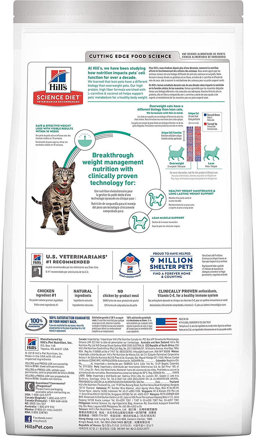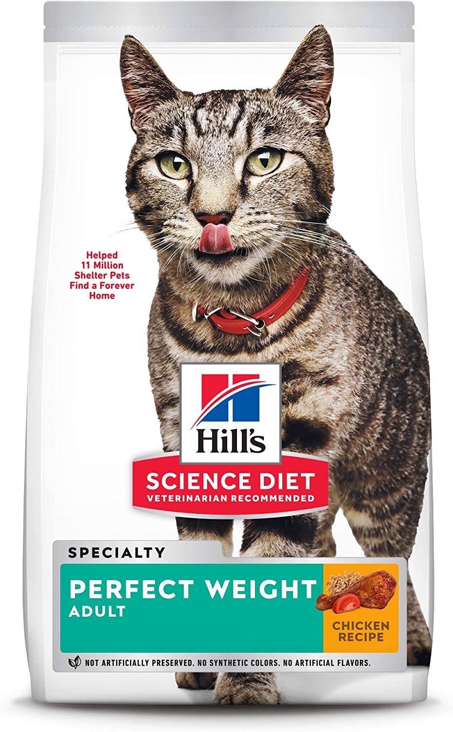 Whether your cat has a noticeable weight issue, or you would just like to keep your feline friend at a healthy weight, Hill's Science Diet Perfect Weight dry cat food provides your adult cat with delicious, breakthrough weight management nutrition. With a savory chicken flavor, over 70% of pets lost weight within 10 weeks when fed this this adult cat kibble. This cat food made with natural ingredients provides high-quality protein that will keep your kitty satisfied between meals while maintaining lean muscle. There’s more to love with the new look of Science Diet. Some of our products also have new names, new kibble shapes & new formulas.