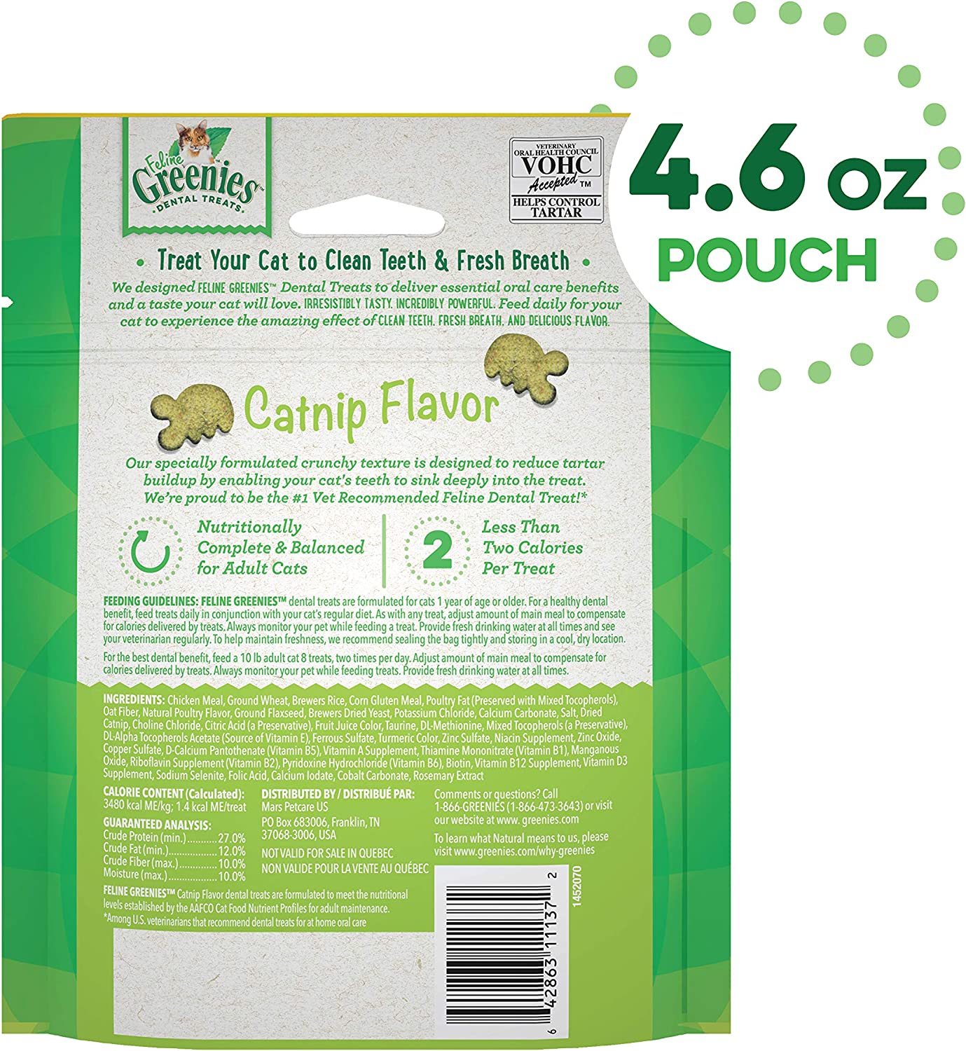FELINE GREENIES Catnip Flavor Dental Cat Treats were designed to help keep your cat’s teeth clean and healthy. The crunchy texture of these irresistible cat snacks helps clean teeth, reduce tartar buildup, and freshen cat breath, letting you enjoy cuddle time even more. Made with natural ingredients plus vitamins, minerals, and other nutrients, these tasty treats are also nutritionally complete and balanced for adult cats. Plus, FELINE GREENIES Dental Treats contain less than 2 calories per treat and are the #1 vet-recommended feline dental treat.* Give your cat FELINE GREENIES Dental Treats and you're sure to hear happy purrs of joy. FELINE GREENIES Daily Dental Treats... for healthy and happy dental care. * Among U.S. veterinarians who recommend dental treats for at-home oral care.