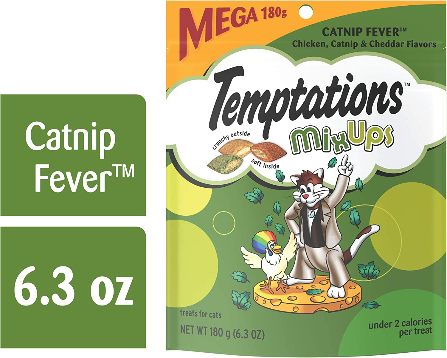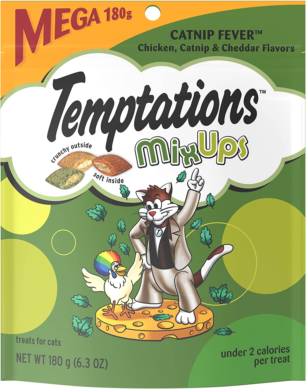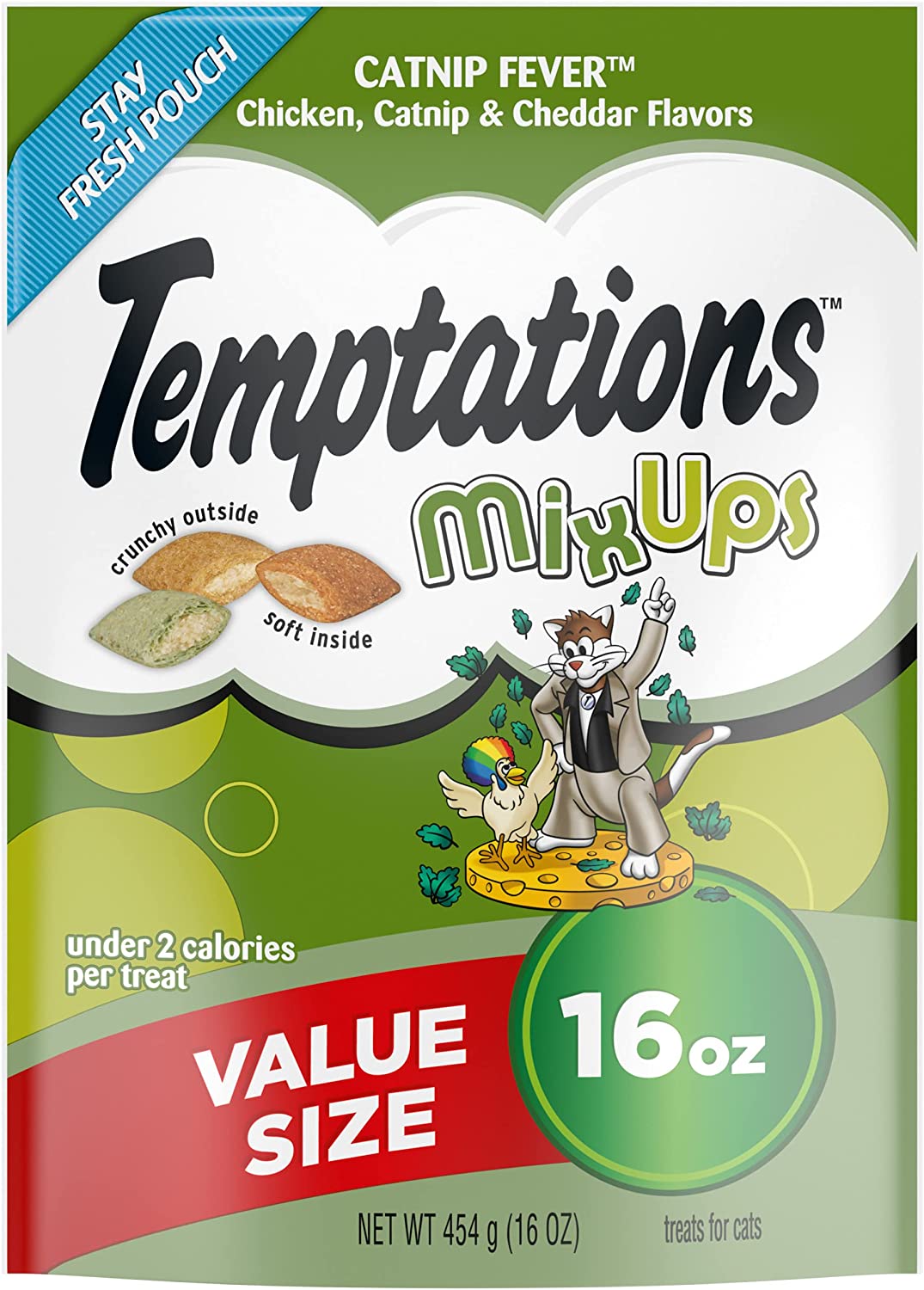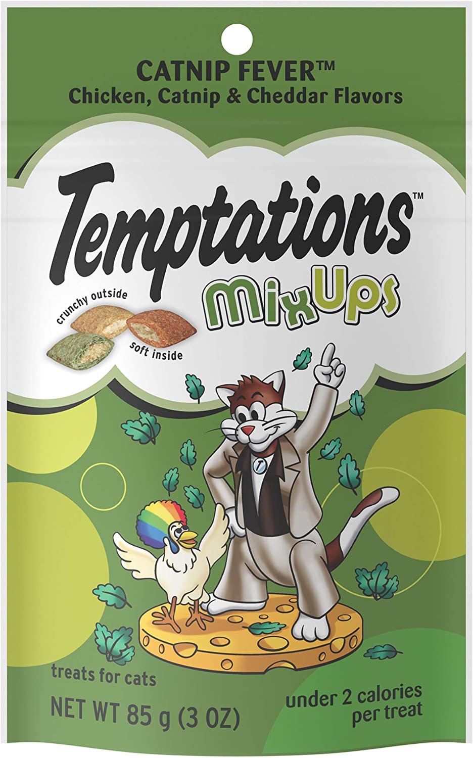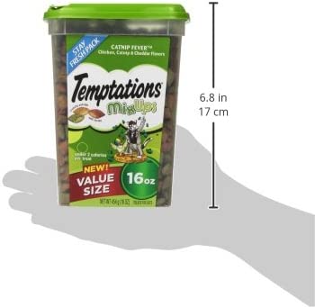 Reward your cat with scrumptious playtime cat snacks that are 100% nutritionally complete for adult cat maintenance and that help to control tartar. Featuring a tempting mix of flavors, such as chicken, catnip and cheese, Temptations MixUps variety cat treats are a great-tasting playtime reward. They're the perfect size treats for cat toys, so try placing a few inside a treat dispenser toy and watch your cat chase and swat away. Plus, at only 2 low calories per treat, your feline friend can enjoy the crunchy outside and soft center anytime. America's No.1 cat treat is the perfect way to show your feline friend how much you care. (Based on 2020 Nielsen sales data).