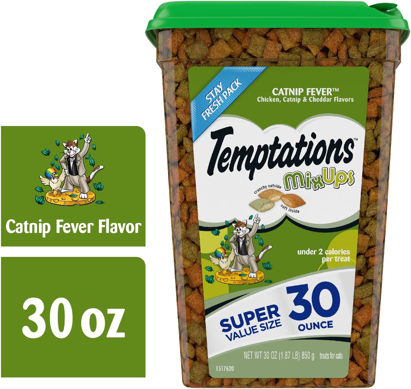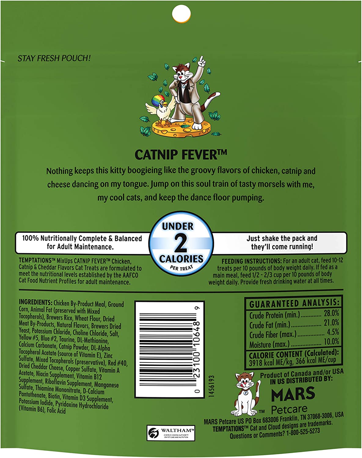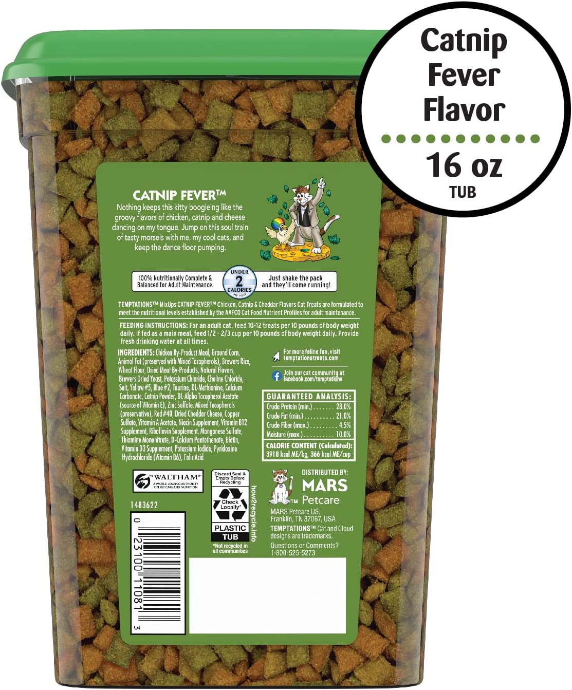 Reward your cat with scrumptious playtime cat snacks that are 100% nutritionally complete for adult cat maintenance and that help to control tartar. Featuring a tempting mix of flavors, such as chicken, catnip and cheese, Temptations MixUps variety cat treats are a great-tasting playtime reward. They're the perfect size treats for cat toys, so try placing a few inside a treat dispenser toy and watch your cat chase and swat away. Plus, at only 2 low calories per treat, your feline friend can enjoy the crunchy outside and soft center anytime. America's No.1 cat treat is the perfect way to show your feline friend how much you care. (Based on 2020 Nielsen sales data).