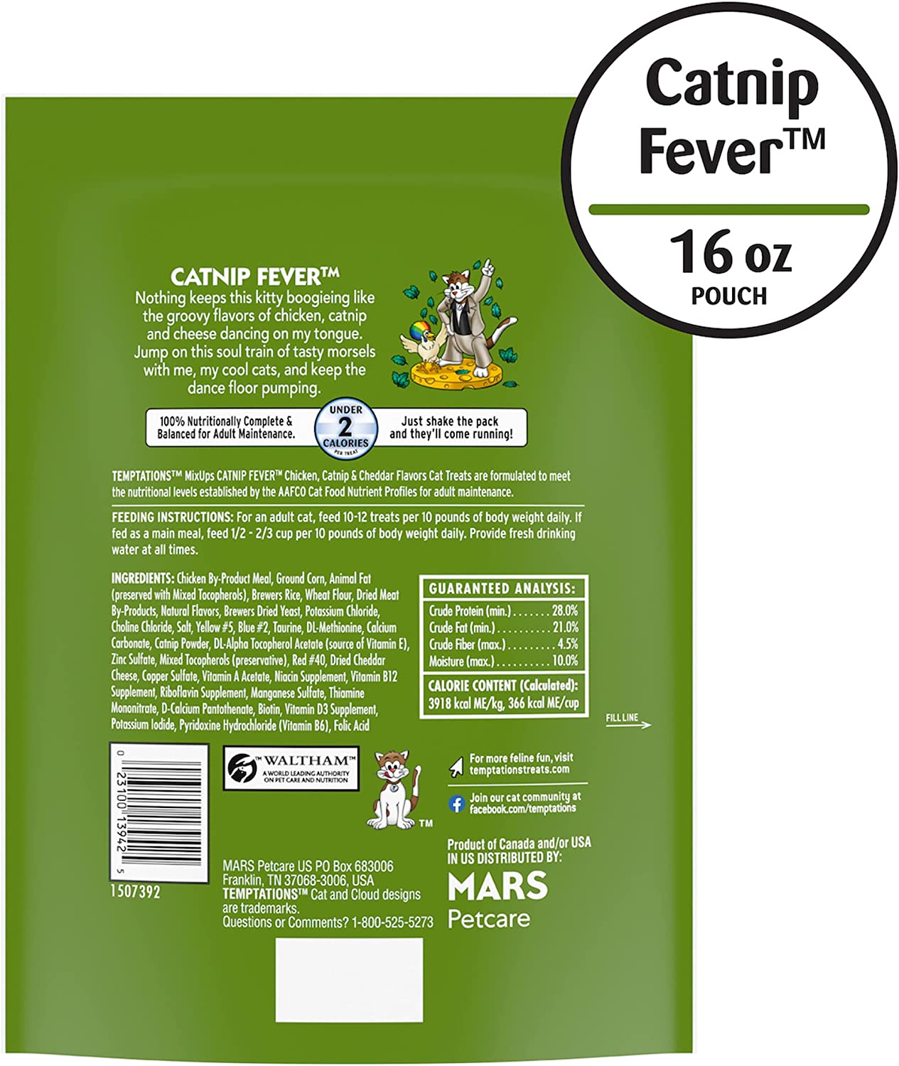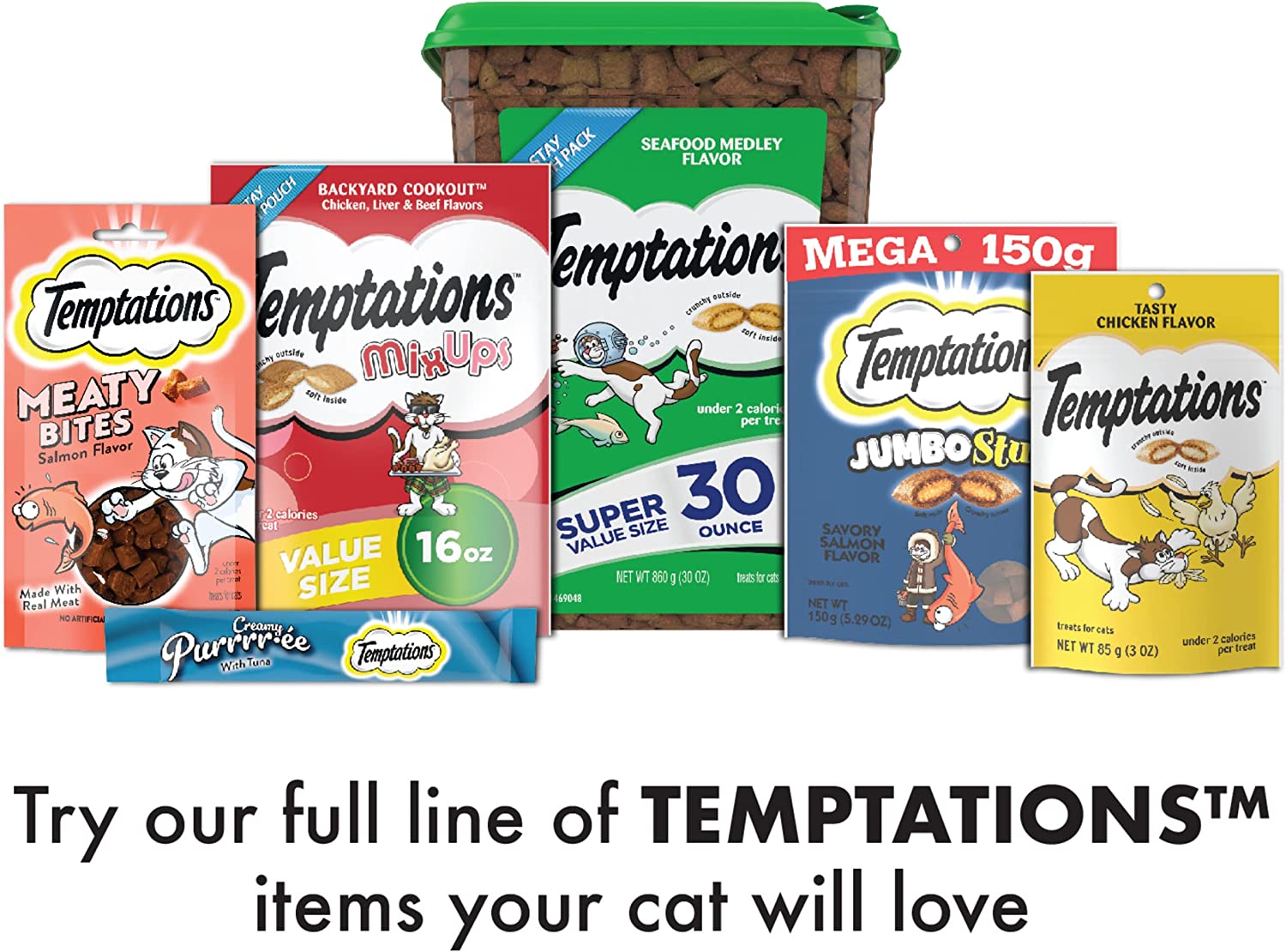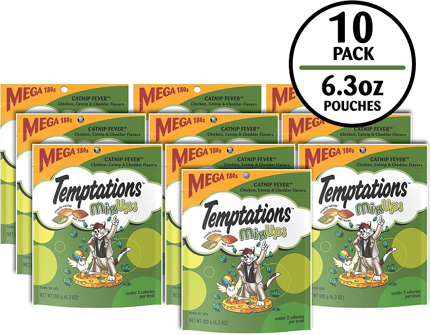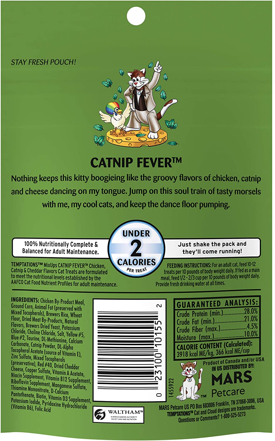 Reward your cat with scrumptious playtime cat snacks that are 100% nutritionally complete for adult cat maintenance and that help to control tartar. Featuring a tempting mix of flavors, such as chicken, catnip and cheese, Temptations MixUps variety cat treats are a great-tasting playtime reward. They're the perfect size treats for cat toys, so try placing a few inside a treat dispenser toy and watch your cat chase and swat away. Plus, at only 2 low calories per treat, your feline friend can enjoy the crunchy outside and soft center anytime. America's No.1 cat treat is the perfect way to show your feline friend how much you care. (Based on 2020 Nielsen sales data).
