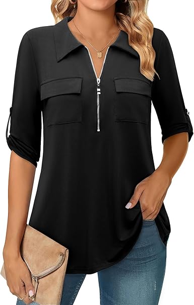 Bulotus Women's 3/4 Sleeve Collared Blouses Business Casual Zip Front V Neck Loose Fit Tunic Tops
