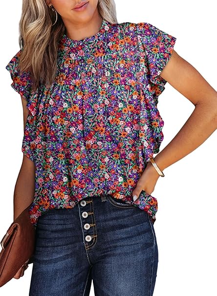 Dokotoo Womens Summer Tops Casual Crewneck Floral Print Shirts Smocked Ruffle Short Sleeve Babydoll Blouses