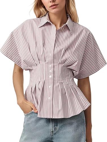 Women Striped Button Pleated Shirt Short Sleeve Summer Casual Peplum Blouse