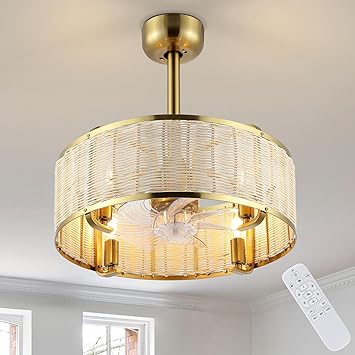 18.5" Caged Ceiling Fan with Lights and Remote Control, Rattan Ceiling Fan with Reversible Motor, 6 Speeds, Bladeless Low Profile Ceiling Fan Light for Kitchen Bedroom, Dining Room, Gold