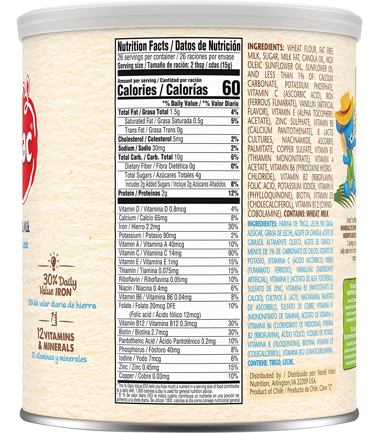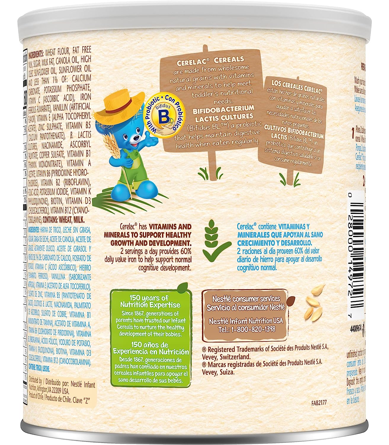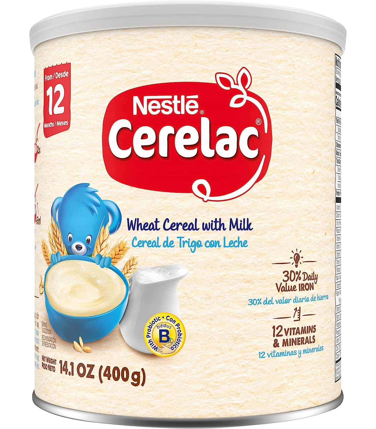 Nestle Cerelac Cereal, Wheat Cereal with Milk, 14.1 Ounce Canister: Made for Toddlers 12 months. Made with wholesome grains and vitamins and minerals, including iron to help support brain development and learning ability. Two servings of Cerelac Wheat Cereal with Milk provides 60% daily value of iron. Cerelac is crafted from wholesome natural grains to help nourish little tummies. Simply add warm water and stir until creamy for a satisfying cereal for your little one. Our Wheat Cereal with Milk contains B. Lactis cultures, a probiotic that helps support digestive health when eaten regularly.