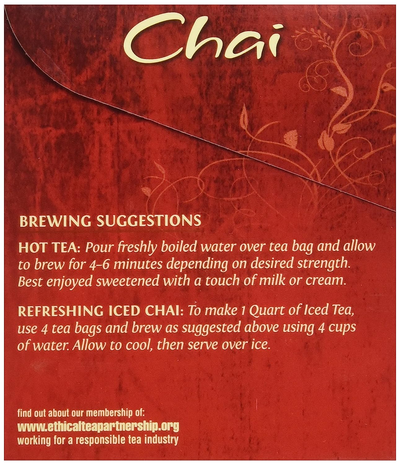 • HOW TO BREW THE PERFECT CUP OF SPICED CHAI TEA: Bring the water to a boil and pour over the tea bag as soon as it reaches the boiling point (over-boiling the water can cause tea to taste flat); steep for 3-5 minutes.