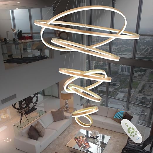 196.85" Gold Modern Chandelier, Extra Large High Ceiling Chandelier, 47.24" 8 Rings Chandelier, Luxury Dimmable Gold Led Chandelier for Entryway, Gold Staircase Chandelier Light Fixture