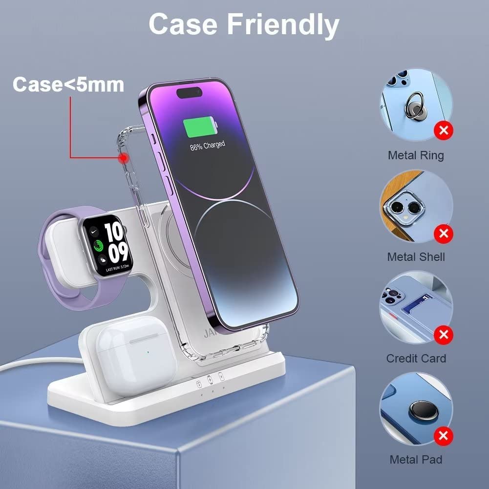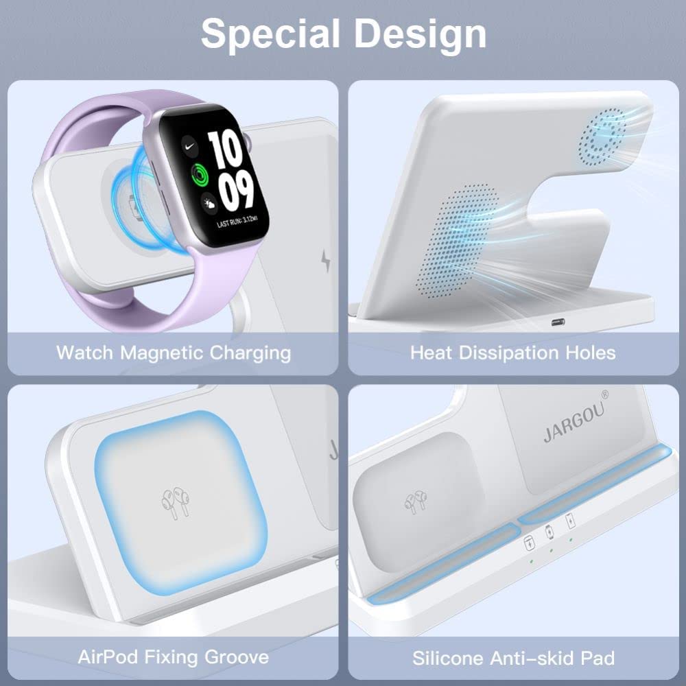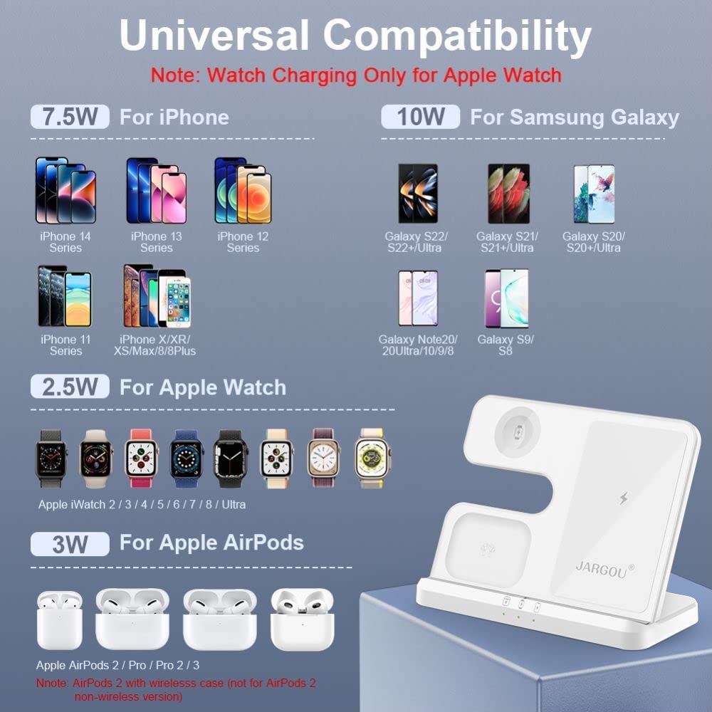 • ใ€3 in 1 Wireless Charging Stationใ€‘JARGOU charging station for multiple devices for apple products support charge wirelessly for iPhone, watch, for AirPods at the same time. This 3 in 1 charging station for Apple is compatible with iPhone 14/14 Pro/14 Pro Max/13/13 Pro/13 Pro Max/13 mini/12/12 Pro/12 Pro Max/12 mini/11/11 Pro/11 Pro Max/XS/XR/XS MAX/X/8/8/Plus or Android; for iWatch Ultra/SE/6/5/4/3/2 & for AirPods Pro/3/2 with wireless case(not for Airpods 2 non-wireless version)