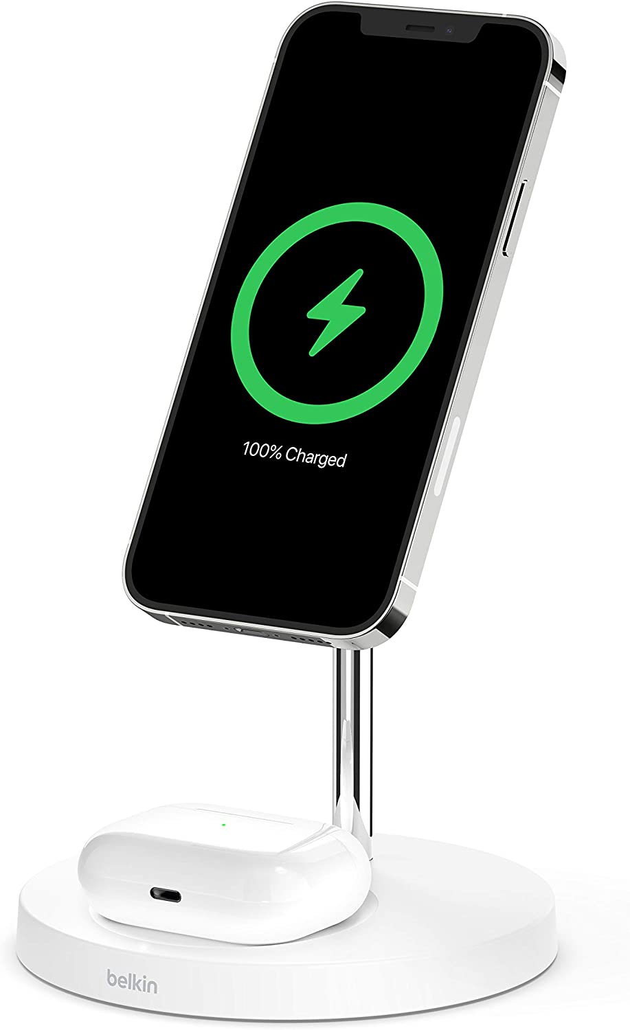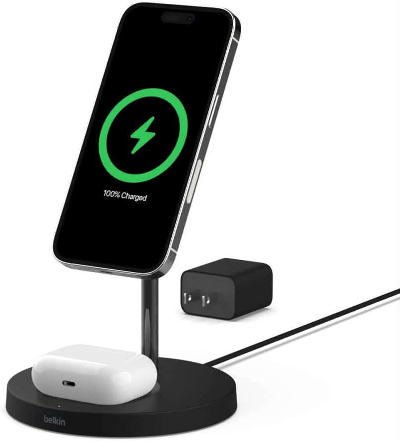 The Belkin MagSafe 3-in-1 Wireless Charging Pad supports multiple device orientations, just place your iPhone on the charging pad for a secure, aligned connection. The wireless charging puck and pad are optimized for your Apple Watch, AirPods and AirPods Pro. With its slim design and folding plug prongs, it’s easy to slip into your bag for travel. And if you have multiple devices that use wireless charging, this is the perfect option for keeping them all charged while on the go.