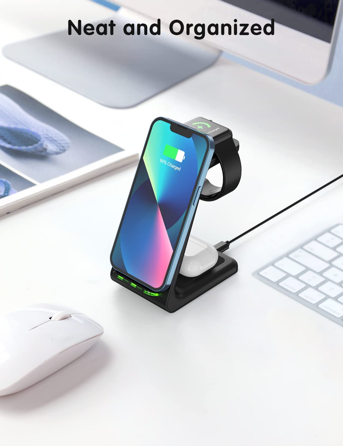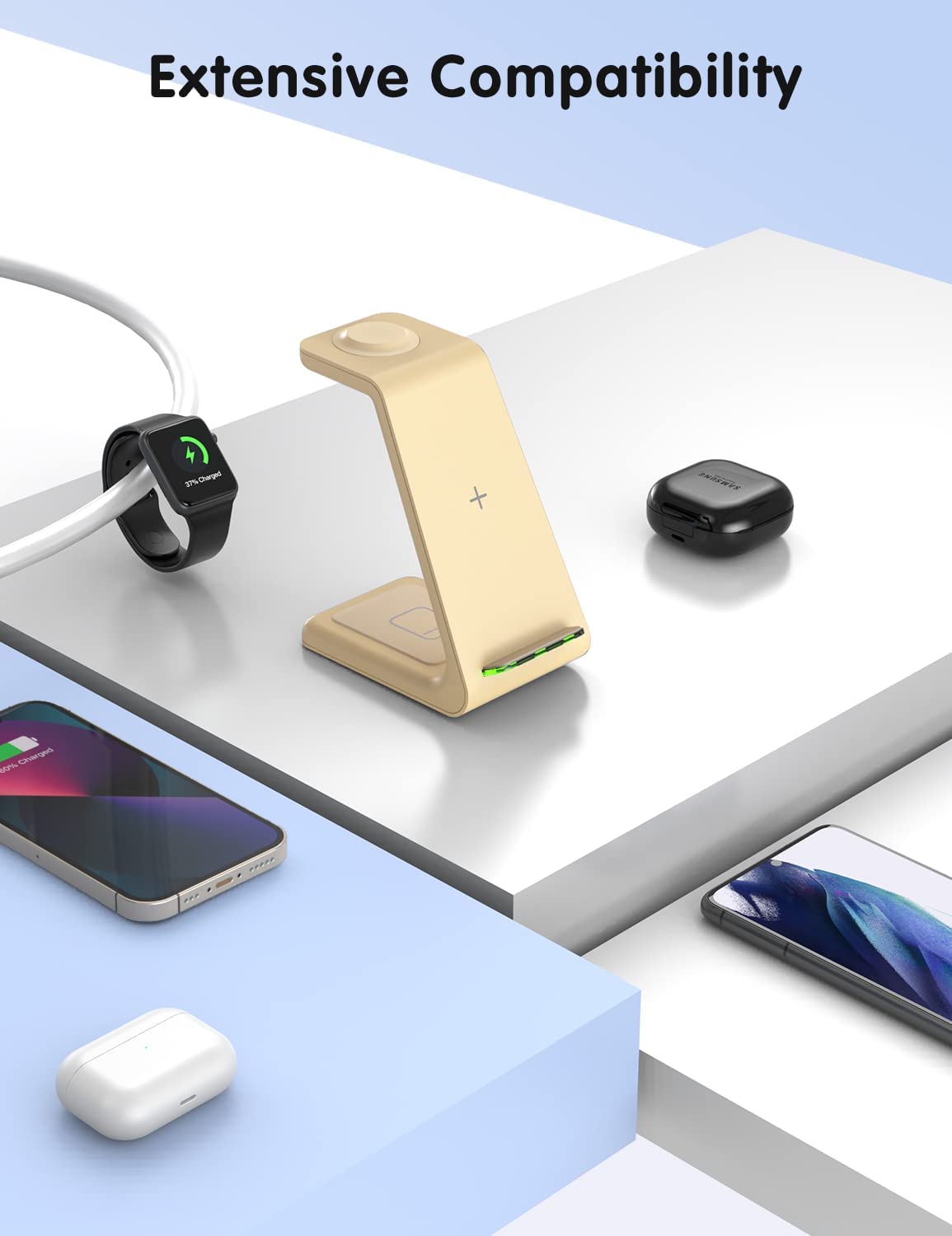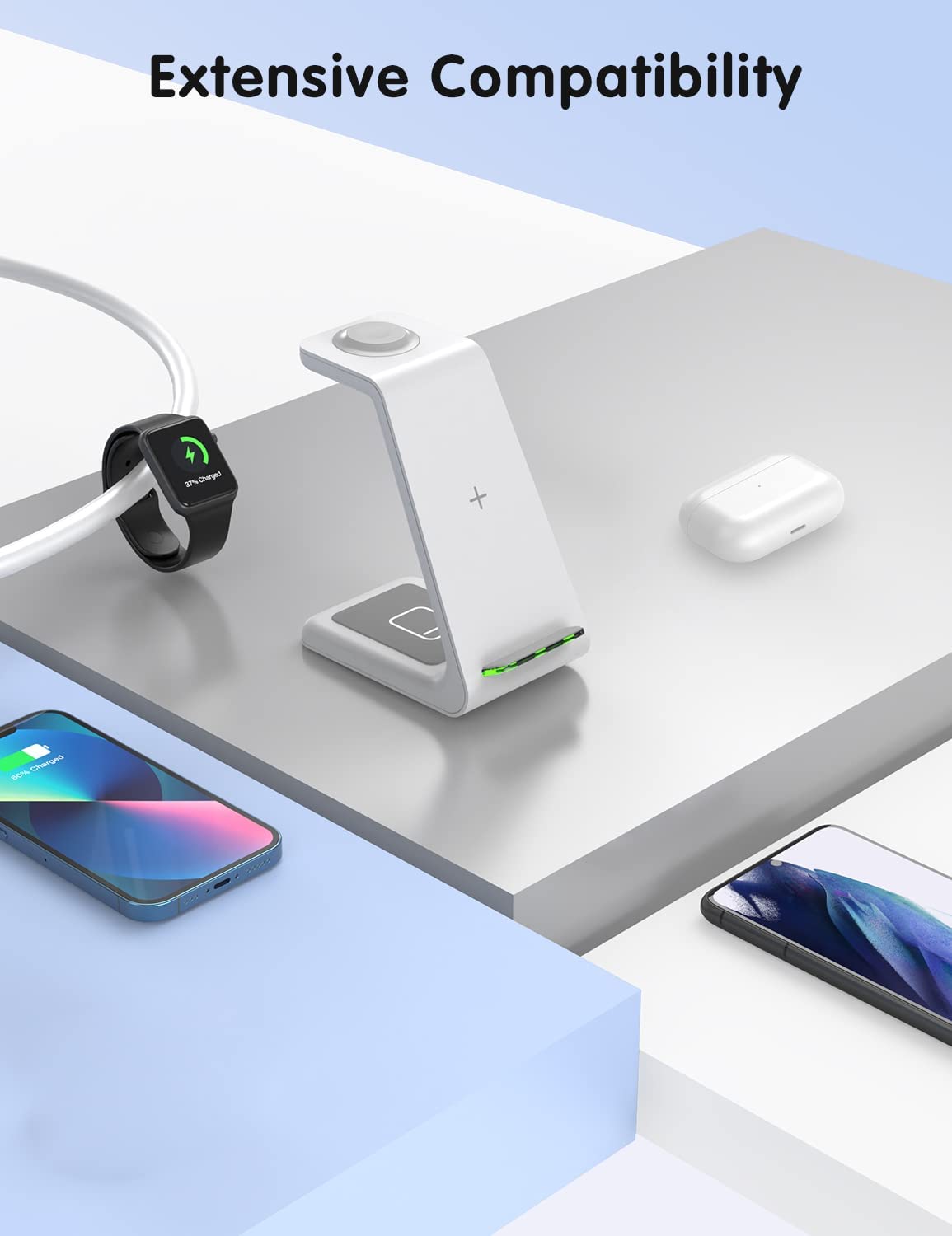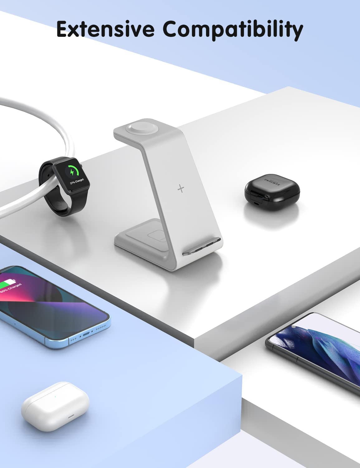 • Charging Station for Multiple Devices Apple: This JoyGeek 3 in 1 wireless charger can charge 3 devices at one time - iPhone, iWatch & AirPods by connecting one cable. Compatible phone models are iPhone 14/14 Plus/14 Pro/14 Pro Max, 13/13 Pro/13 Pro Max, 12/12 Pro/12 Pro Max, 11/11 Pro/11 Pro Max, SE/X/ XR/XS/XS Max/8/8 Plus; Compatible for Apple Watch Series 8/7/6/SE/5/4/3/2 (Not for other brands watch) and Airpods 3/ AirPods 2/ AirPods Pro (Need charge with the wireless charging case).