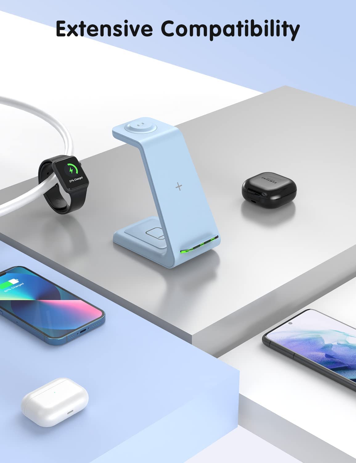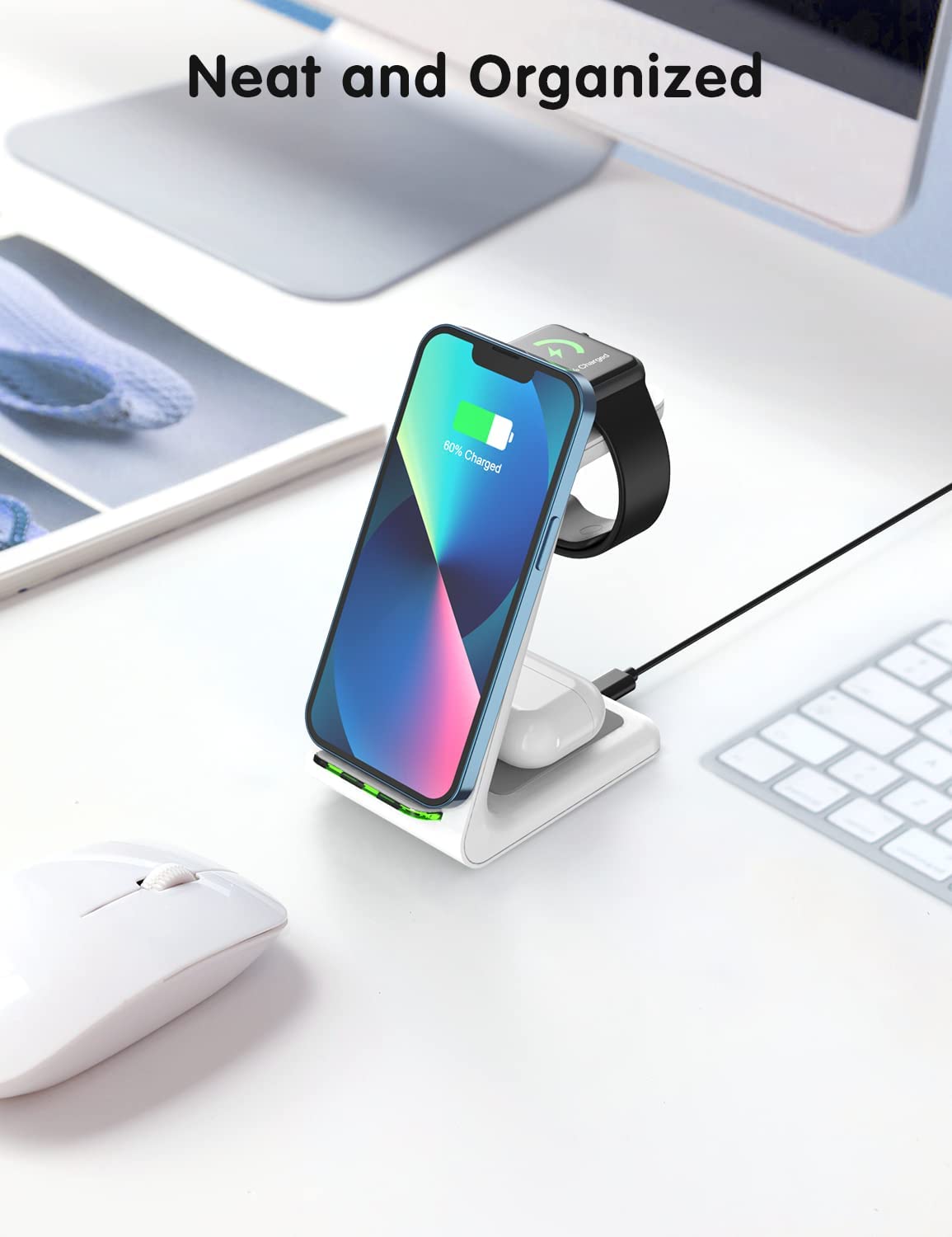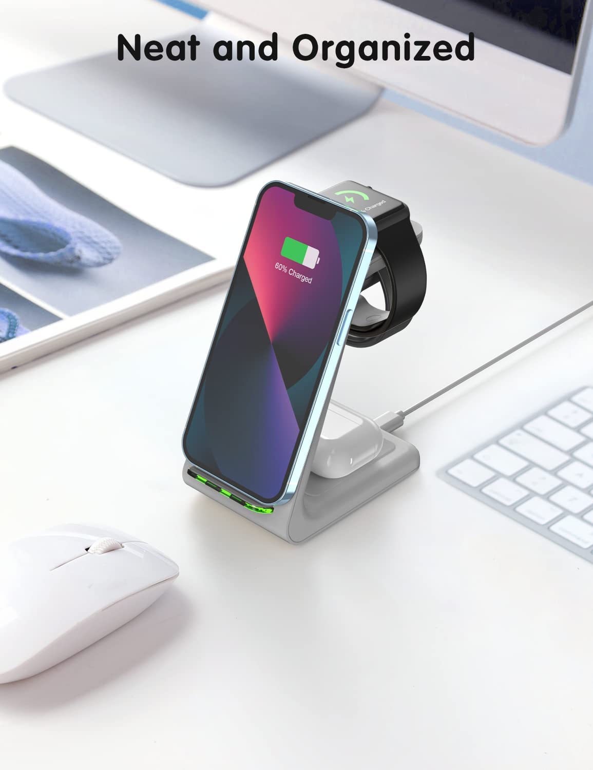 • Charging Station for Multiple Devices Apple: This JoyGeek 3 in 1 wireless charger can charge 3 devices at one time - iPhone, iWatch & AirPods by connecting one cable. Compatible phone models are iPhone 14/14 Plus/14 Pro/14 Pro Max, 13/13 Pro/13 Pro Max, 12/12 Pro/12 Pro Max, 11/11 Pro/11 Pro Max, SE/X/ XR/XS/XS Max/8/8 Plus; Compatible for Apple Watch Series 8/7/6/SE/5/4/3/2 (Not for other brands watch) and Airpods 3/ AirPods 2/ AirPods Pro (Need charge with the wireless charging case).