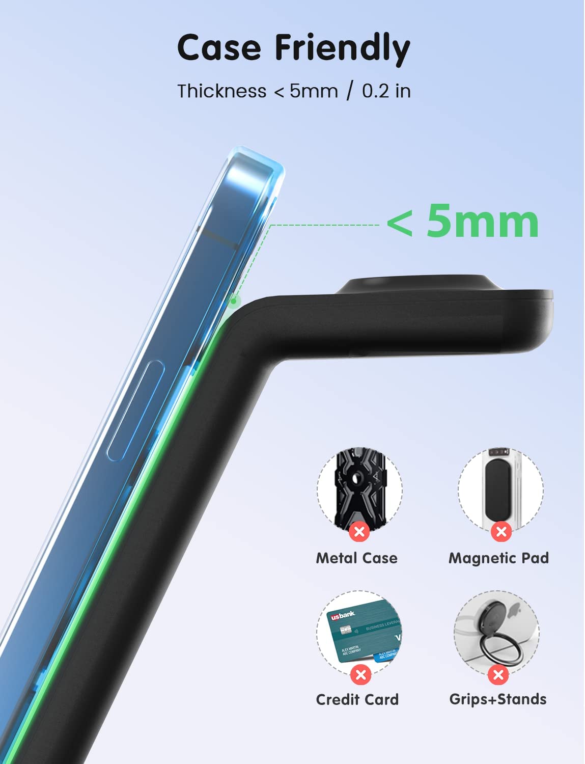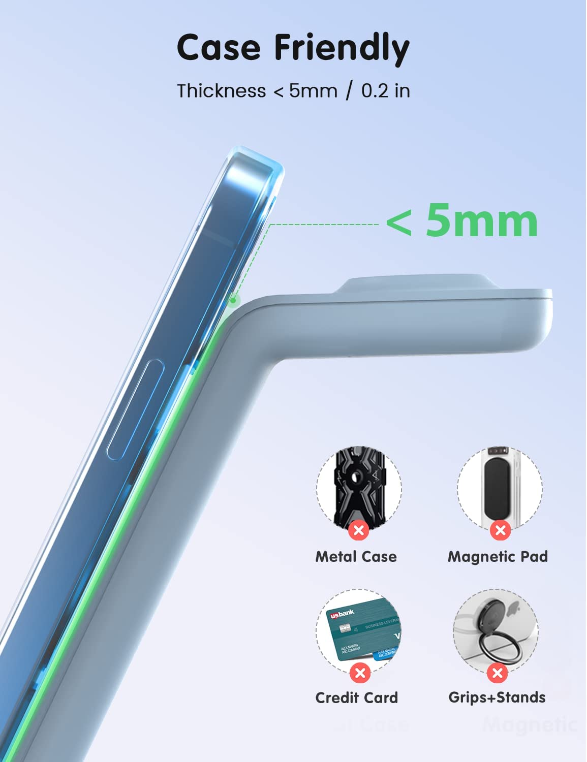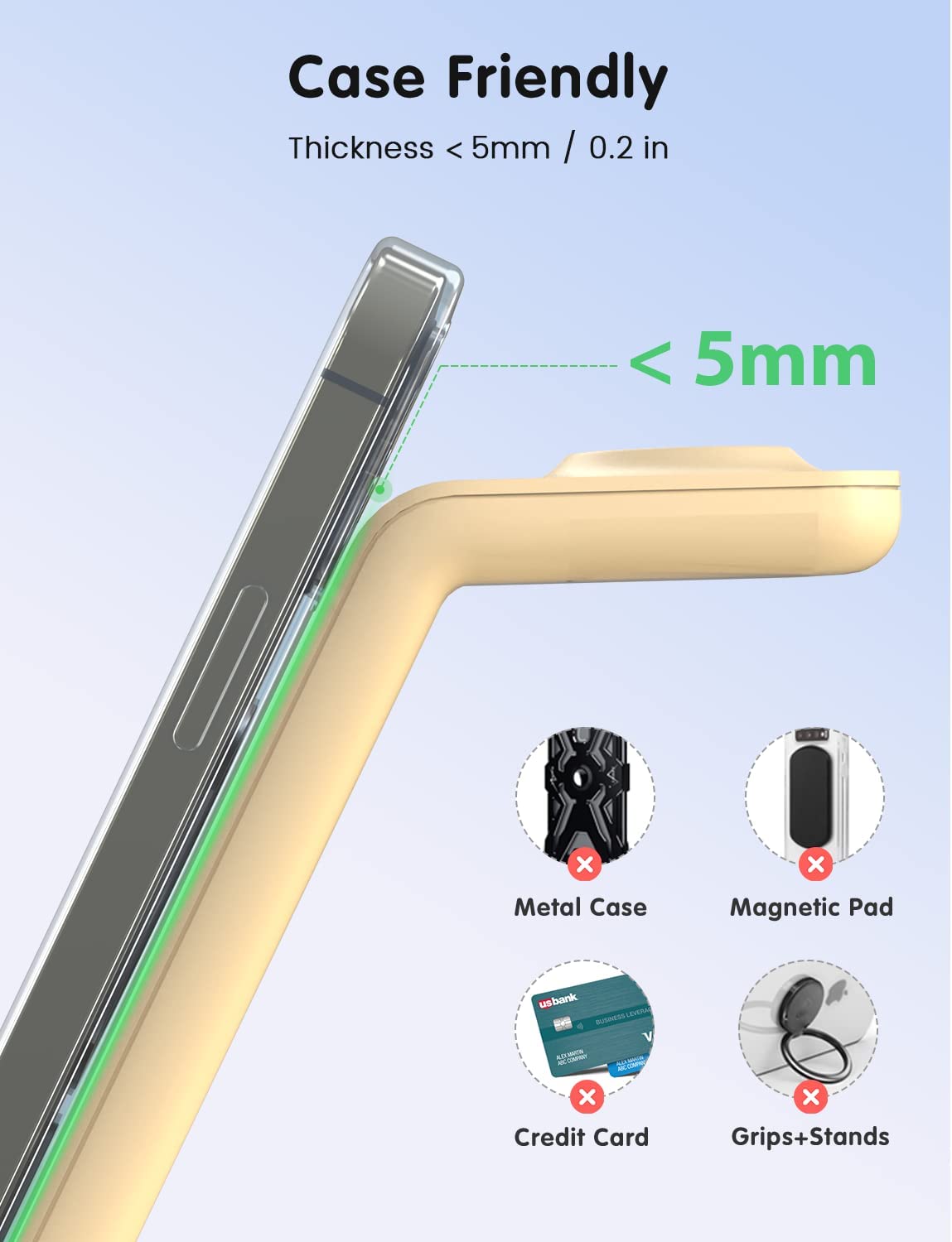 • Phone Case Friendly: Our wireless iPhone charger can charge your phone normally even if 0.2 in (5 mm) thick phone case, like smooth silicone case, smooth clear case and official magnetic case. But the metal case, magnetic pad, credit card, grips & stands and case with a thickness greater than 0.2 in (5 mm) will interfere with charging. Please take off these cases when charging.