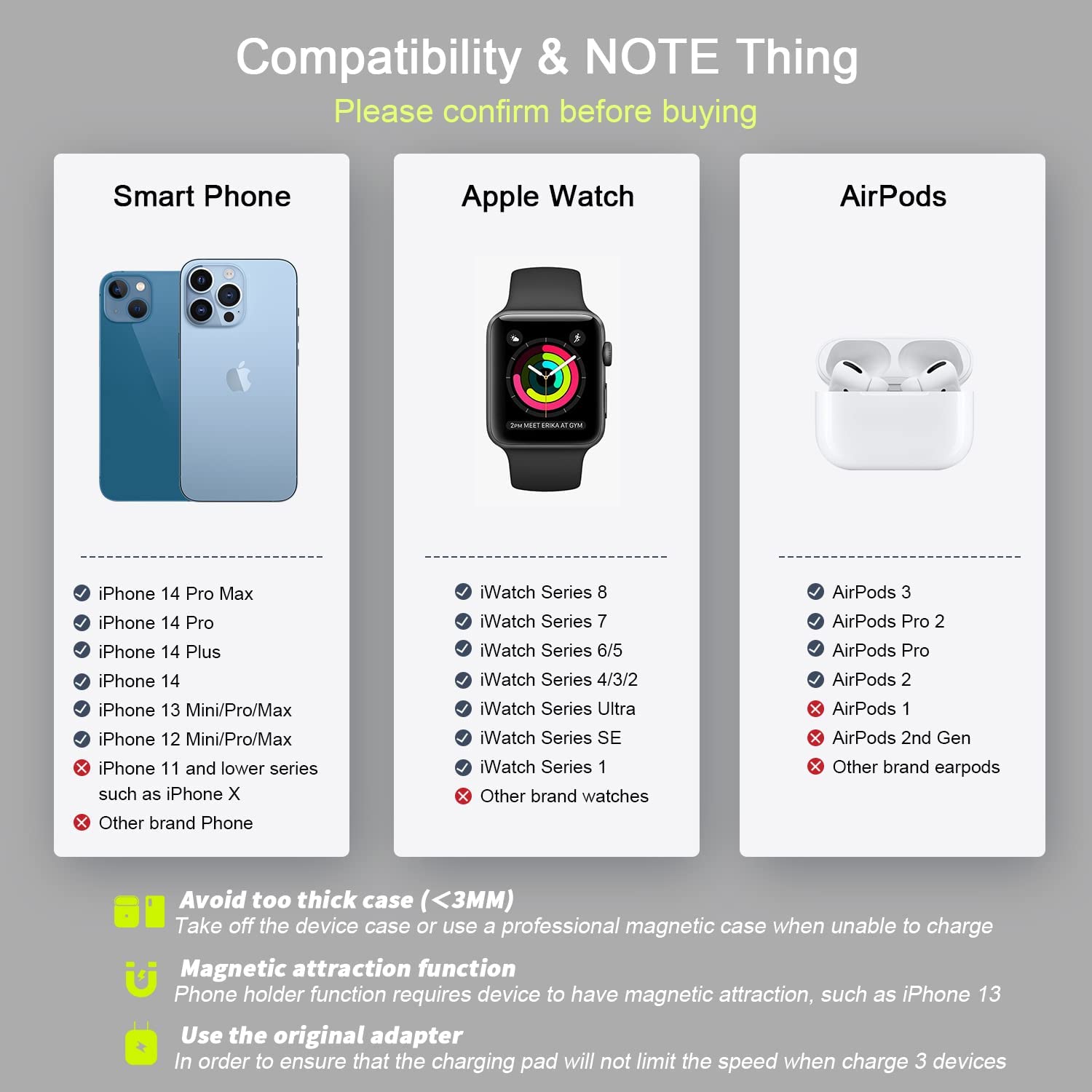 • Extreme Speed 3 in 1 Wireless Charger: You can charge your apple products simultaneously through this 3-in-1 wireless charging station. It charges your iPhone, Apple Watch and AirPods at the same time. The wireless charging stand outputs up to 7.5W for Phones, 5W for AirPods and 3W for Apple Watch. Powered by the included 18W adapter, matched with wireless iPhone charger with built-in upgrade coil your charging speed can be increased by 35%.