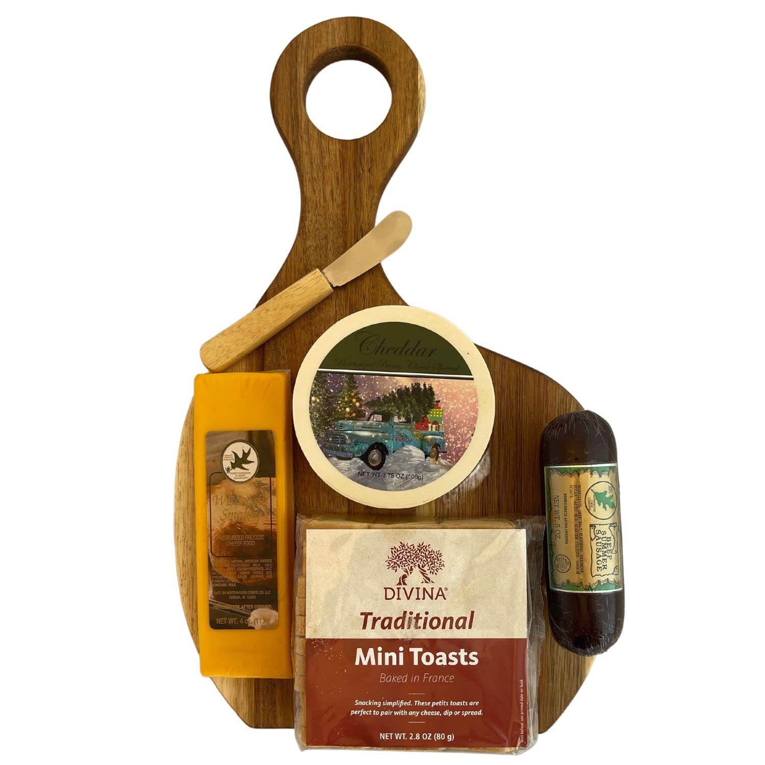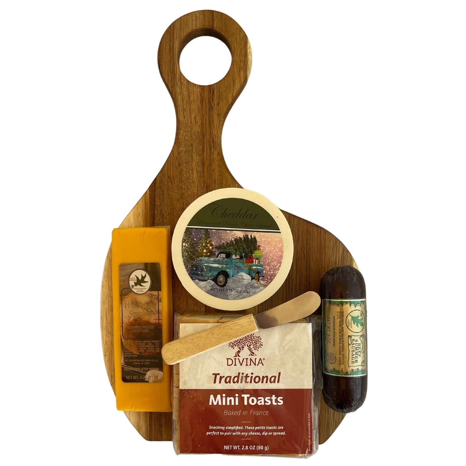 CHRISTMAS GIFT BASKETS Sampler Christmas Cutting Board, beef summer sausage (5oz), Mini Toast Crackers (3.75 oz), Wisconsin Smokey Cheese (4oz) , Cheddar Cheese Spread 3,75 oz and keepsake wooden cheese spreading knife. Everything packaged in on a beautiful wooded cutting board - nice enough to keep on display in kitchen! Festive vintage Christmas truck filled with presents and Christmas tree design on cheese spread. This is the perfect Christmas Xmas Holiday Gift for anyone that loves meat and cheese! Great gift that is perfect for everyone! Christmas, Thanksgiving, Corporate Gift, Hostess, Client Gift, Employee Gift, Thank You Gift Etc.