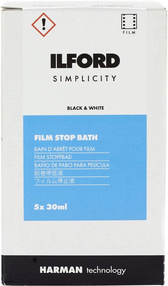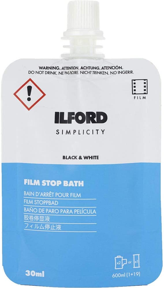ILFORD SIMPLICITY Film Stop Bath is a low odour, citric acid stop bath which stops further development of film when used as part of a standard dev, stop, fix and wash film development process.We recommend that all black & white films are rinsed in a stop bath after development as this can prolong the life of the fixer by neutralising the developer.The SIMPLICITY Film Stop Bath contains ILFORD ILFOSTOP in an easy to use sachet containing the correct amount of photo chemicals to develop 2 rolls of 35mm (135) film or 1 roll of 120 film when using a 2-reel, 600ml developing tank at a dilution of 1+19.ILFORD SIMPLICITY Film Stop Bath is available as single sachets, multi packs of 5 sachets or as part of a Starter Pack containing 1 x film developer, 1 x stop bath, 1 x fixer, 1 x wetting agent.