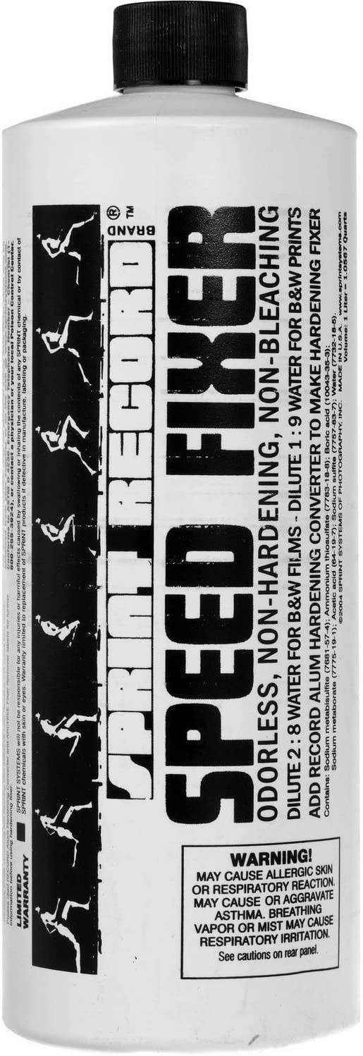 RECORD is the basic fixer for all SPRINT SYSTEMS processes. RECORD works quicklywith a favorable pH to fix prints before thiosulfate absorbtion can reach damaging levels, and to promote thorough washing for permanence. Convert RECORD Speed Fixer into a hardening fixer for b&w films and prints with RECORD Alum Hardening Converter, packaged seperately. One liter of concentrate will make 10 liters of print fixer, enough for 600 8x10 fiber prints or 900 8x10 resin-coated prints, or 5 liters of film fixer, enough for 150 rolls of film.