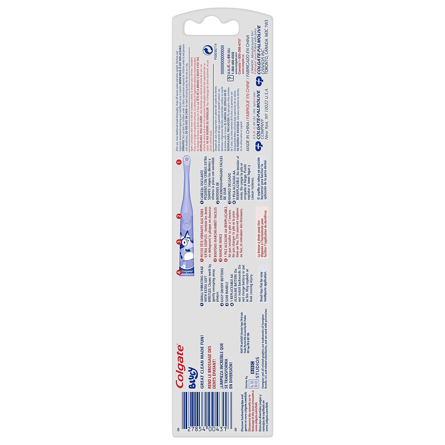 The Bluey Colgate Kids Battery Toothbrush is a kids toothbrush that provides fun toothbrushing to keep children’s teeth clean and sweep away plaque. With a vibrating brush head, this kids vibrating toothbrush cleans better than a manual toothbrush. The kids toothbrush features a small, oscillating head with extra soft bristles that are gentle on delicate gums. This vibrating toothbrush for kids is battery-powered, so it’s easy to recharge wherever you are (1 AA battery is included). Get the classic Colgate clean you can count on with this Bluey themed Colgate Kids Battery Powered Toothbrush. Good oral health starts at a very young age. Designed for little hands and mouths beginning at ages 3 and up, the Colgate Kids Power Vibrating Toothbrush is a battery toothbrush for kids designed to facilitate a fun and easy toothbrushing experience. The kids battery toothbrush features a slim, easy-to-hold handle to let them do the brushing, while the vibrating brush head does all the work. This kids toothbrush also has a flat-laying handle so kids can easily apply toothpaste without the brush rolling over or away when you set it down. The vibrating brush head is small enough to reach every corner of the mouth.