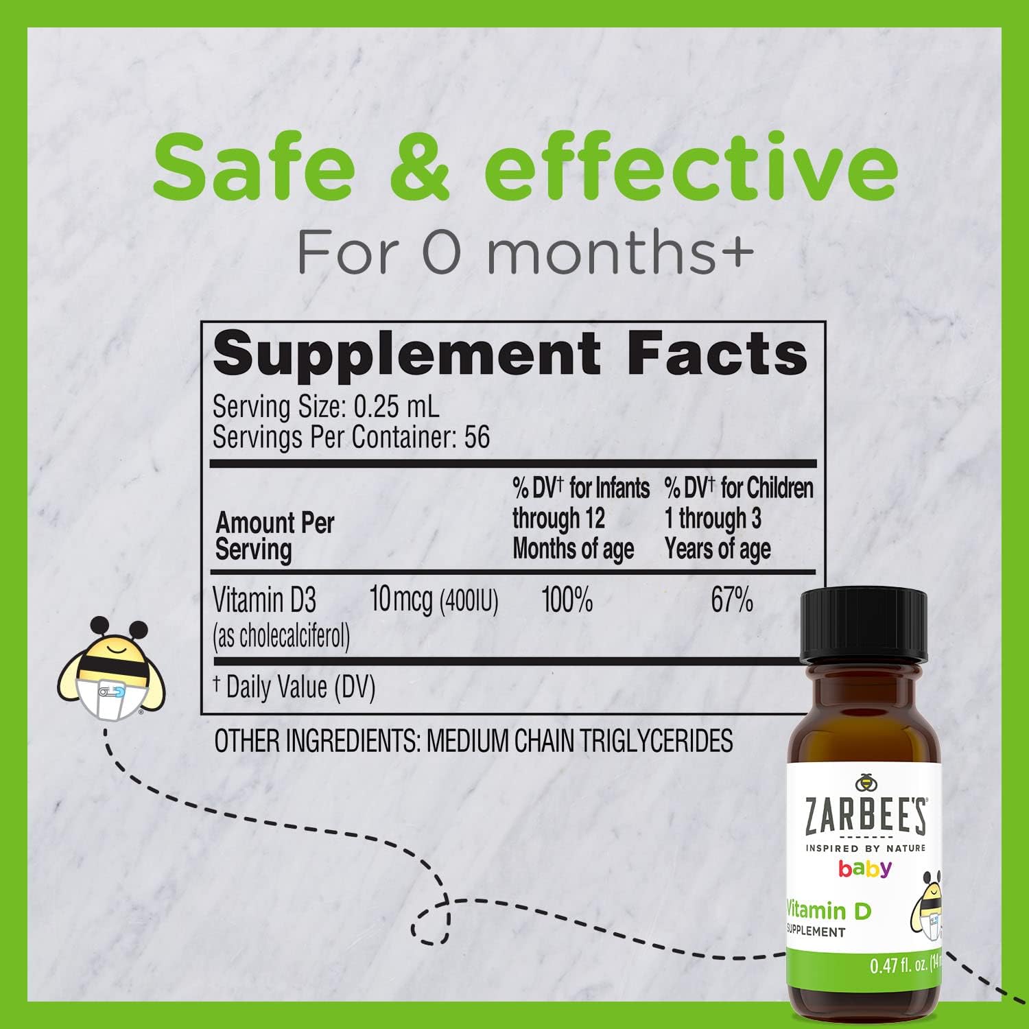 Zarbees Baby Vitamin D is an effective daily liquid vitamin D supplement that is safe for everyday use in infants 0 months+. This liquid vitamin D supplement helps infants and toddlers absorb calcium to develop strong bones and teeth.* The American Academy of Pediatrics recommends 400 IU of vitamin D daily for all breastfed babies and babies who drink less than 1 liter of formula each day. For accurate dosing; a convenient syringe is included to make it easy to deliver 400 IU of liquid vitamin D directly into baby’s mouth or mix with food or drink. Zarbee’s Baby Vitamin D supplement* is safe & effective and has just two ingredients - vitamin D3 & medium chain triglycerides. It is free of drugs; alcohol; artificial flavors or sweeteners; dyes; and gluten. ⱡSoothes coughs associated with hoarseness; dry throat and irritants.* *These statements have not been evaluated by the Food and Drug Administration. This product is not intended to diagnose; treat; cure; or prevent any disease