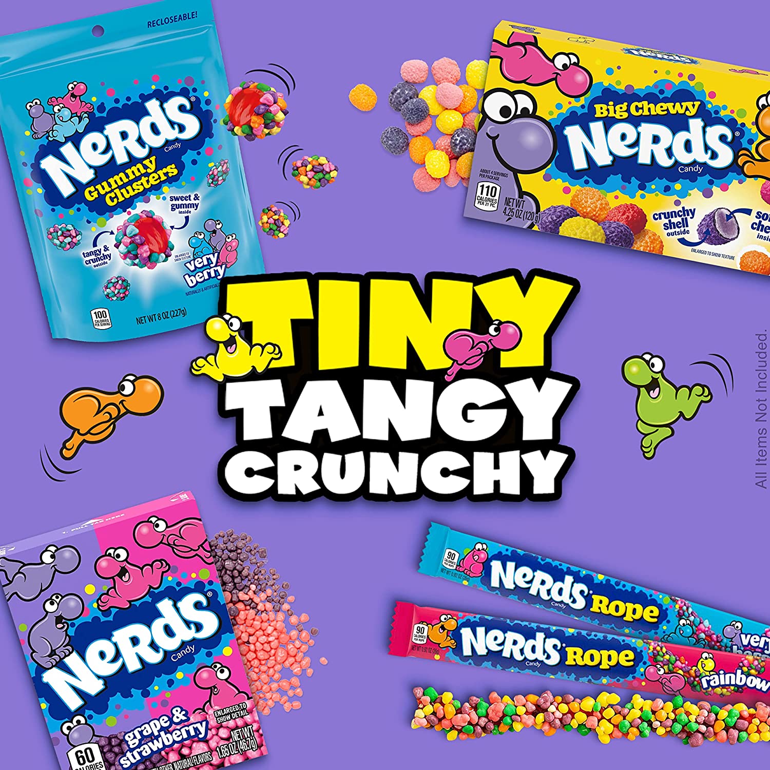 • TRY THEM ALL: From original NERDS to NERDS Ropes to Gummy Clusters to our crunchy & chewy Big Chewy NERDS & with flavors ranging from sweet to tangy, try out all the varieties of this legendary candy