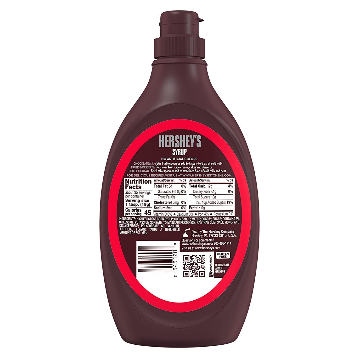 Complement sweet treats with Hershey's Syrup. Pour on Hershey's Syrup's rich, delicious chocolate flavor over favorite desserts. Enjoy genuine chocolate flavor in an easy-to-pour syrup perfect for a variety of snacks and treats. Drizzle this chocolate syrup over ice cream and fruit, stir into beverages, or add chocolate flavor to baked treats. Hershey's Chocolate Syrup is OU Certified as a Kosher dairy product, and is a gluten-free and fat-free food. Easily pour over desserts with the flip-top lid that seals in freshness, and place in the refrigerator after opening. This product ships as a 24-ounce package.