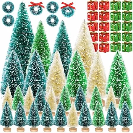 Iceyyyy 56 Pcs Artificial Mini Christmas Trees Set - Miniature Sisal Frosted Christmas Trees Bottle Brush Trees for DIY Crafts Home Table Top Decor