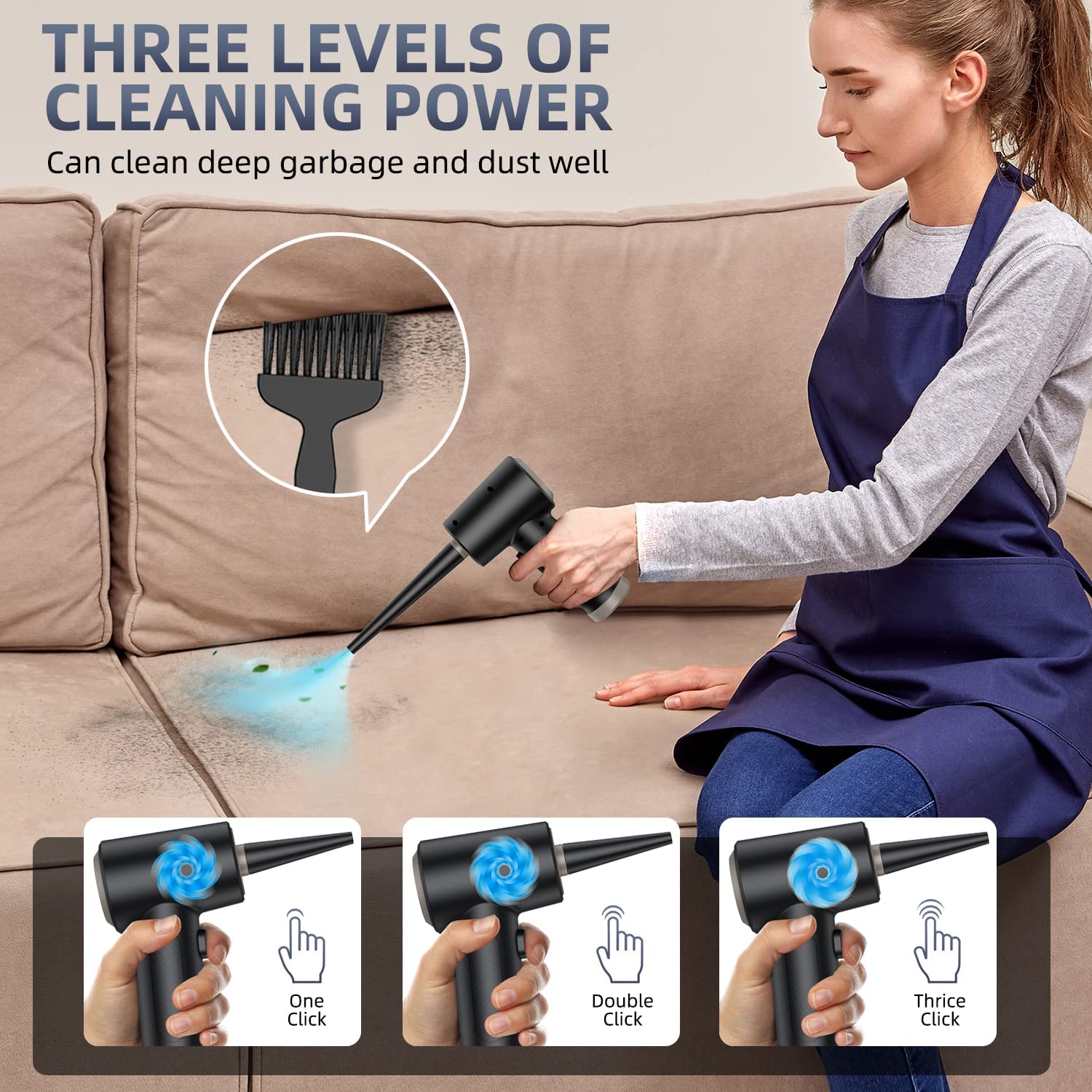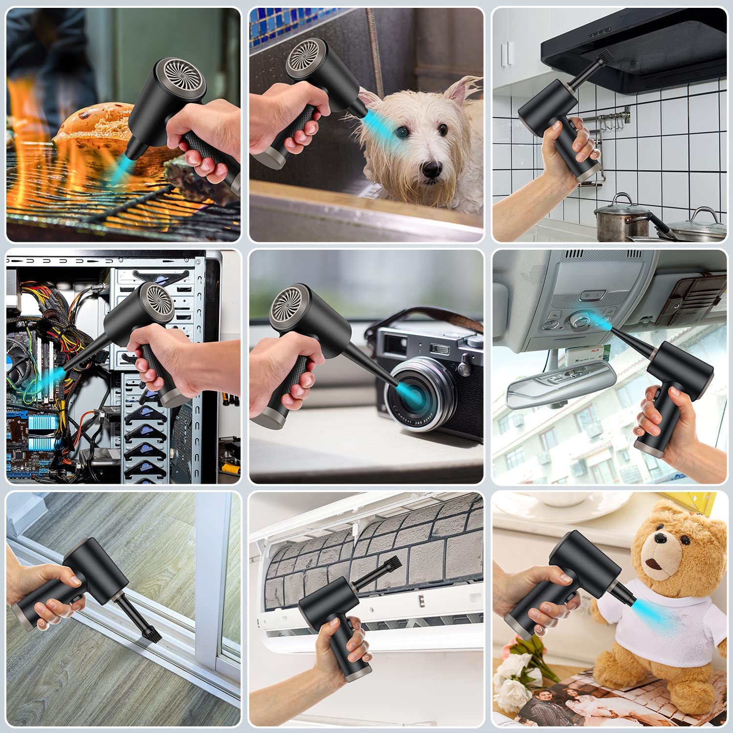 • Compressed air - Multi-use to lots of places:Electric air blower can cleaning computer keyboard, laptop, camera, cleaning car, seat and blinds etc.Thin and long nozzle makes it easier to clean corners or place where hand cannot reach. Air dusters can even be used in products that need to be inflated, inflatable beds, lifeboats, etc.